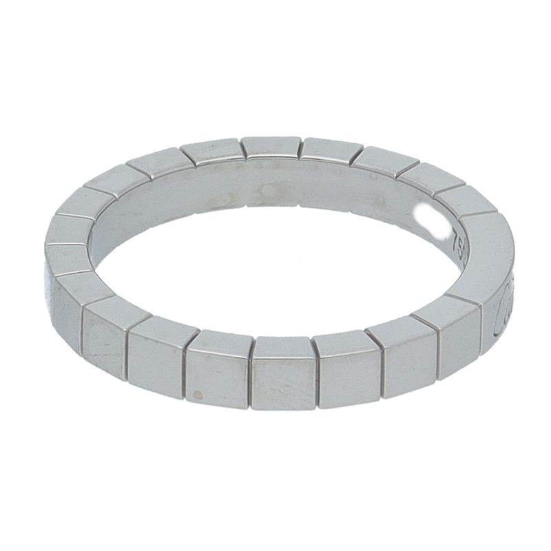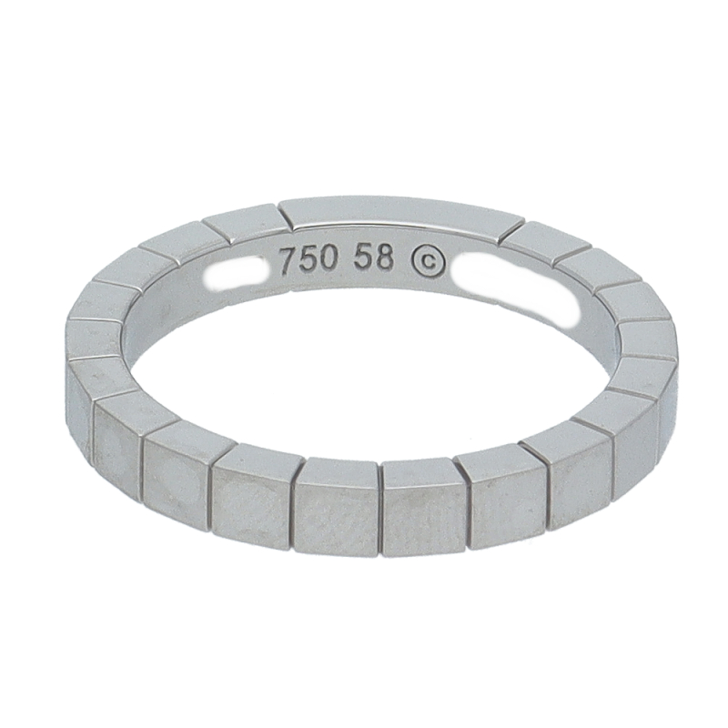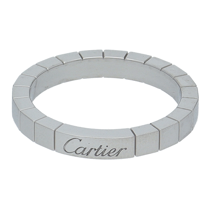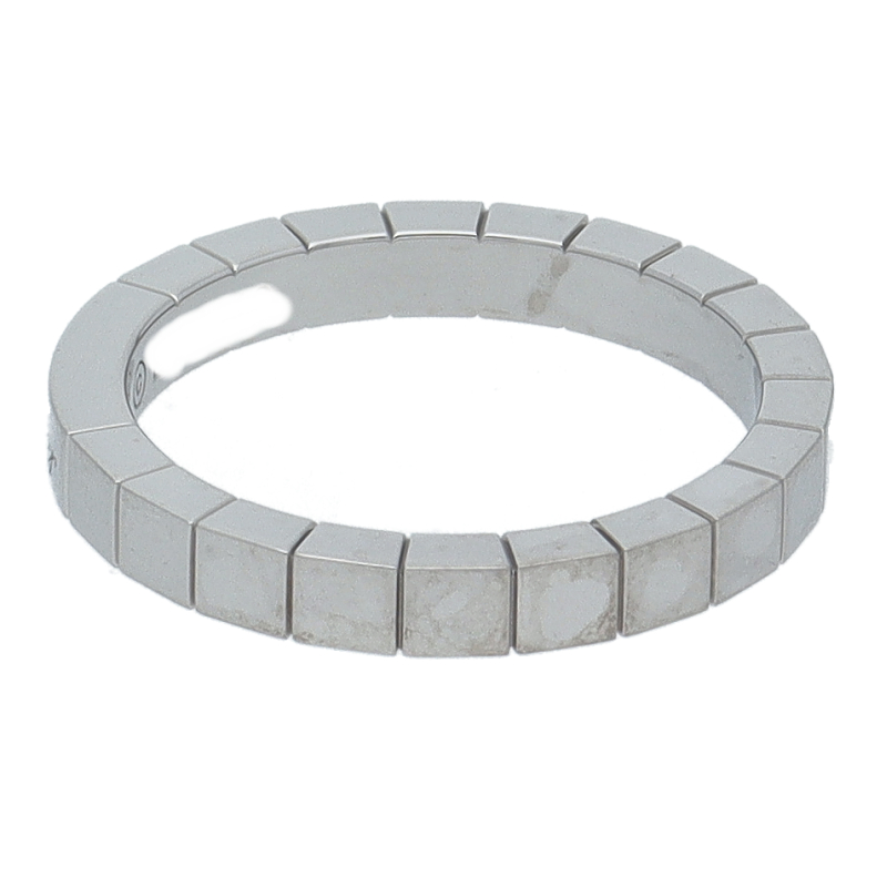 USED品。ホワイトゴールド製。フランス語で「細長い革紐」という意味があり、幾何学模様によって光が反射され、どの角度からも光輝くカルティエの人気のラニエールコレクションです。