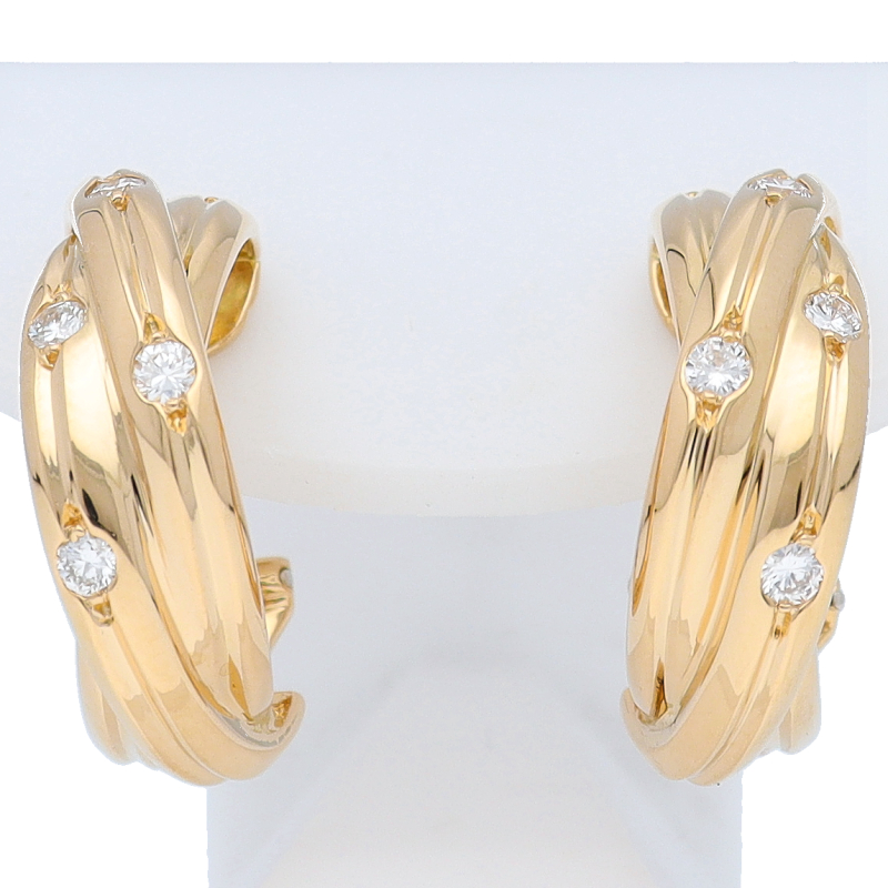 USED品。イエローゴールド製。3色のゴールドではなく、イエローゴールド素材のみを使用した『コンステレーション』コレクション。リングでの展開もあり、トリニティとは、また一味違った3連スタイルが人気です。ボリューム感もあり、存在抜群のカルティエピアスとなりますので、非常に人気です。