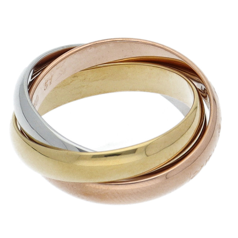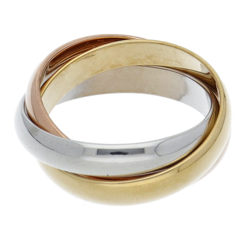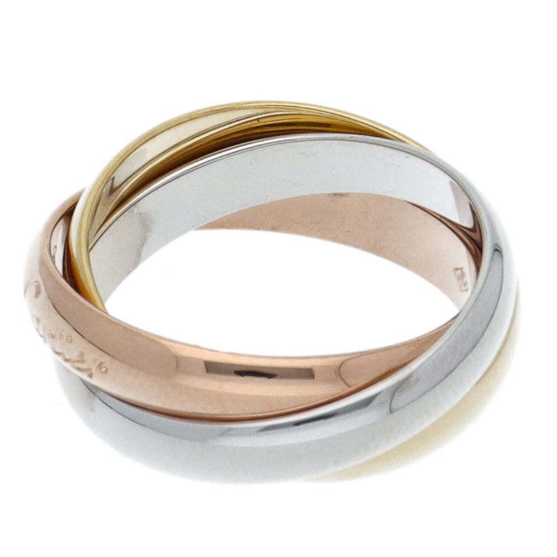 USED品。3カラー製。ピンクが愛、イエローが忠誠、ホワイトが友情を象徴するカルティエの人気のトリニティコレクションです。