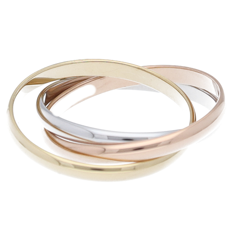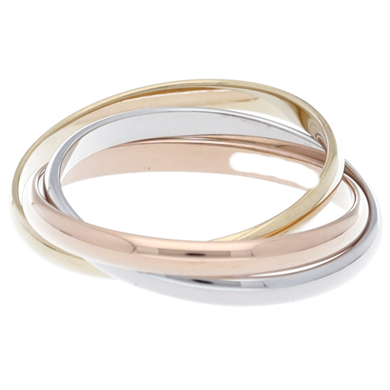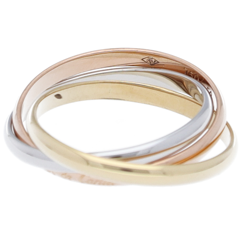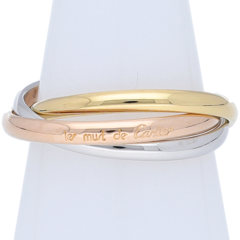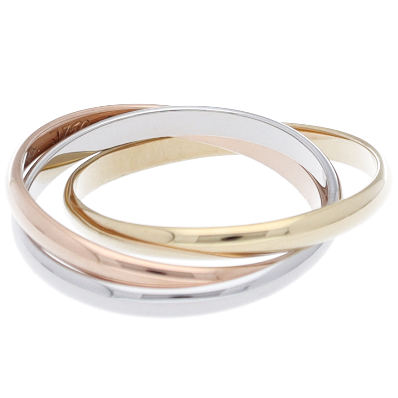 USED品。3カラー製。ピンクが愛、イエローが忠誠、ホワイトが友情を象徴するカルティエの人気のトリニティコレクションです。