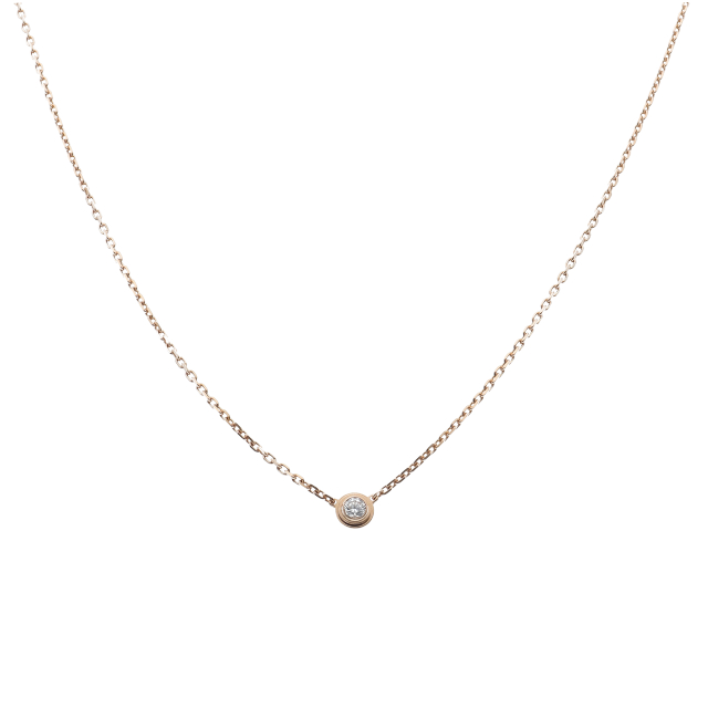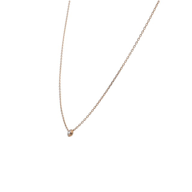 USED品。ピンクゴールド製。世界中のセレブに愛される、カルティエのアイテム。現在は『ダムール ネックレス』に名称を変えております。ワンポイントでデザインされたダイヤが、エレガントな存在感を発揮します。