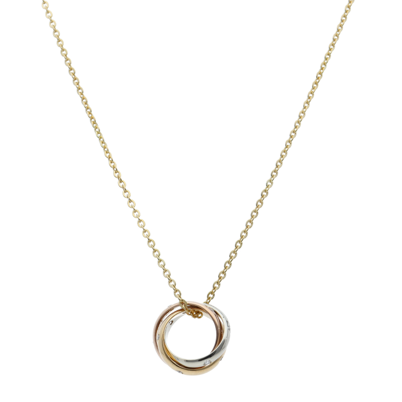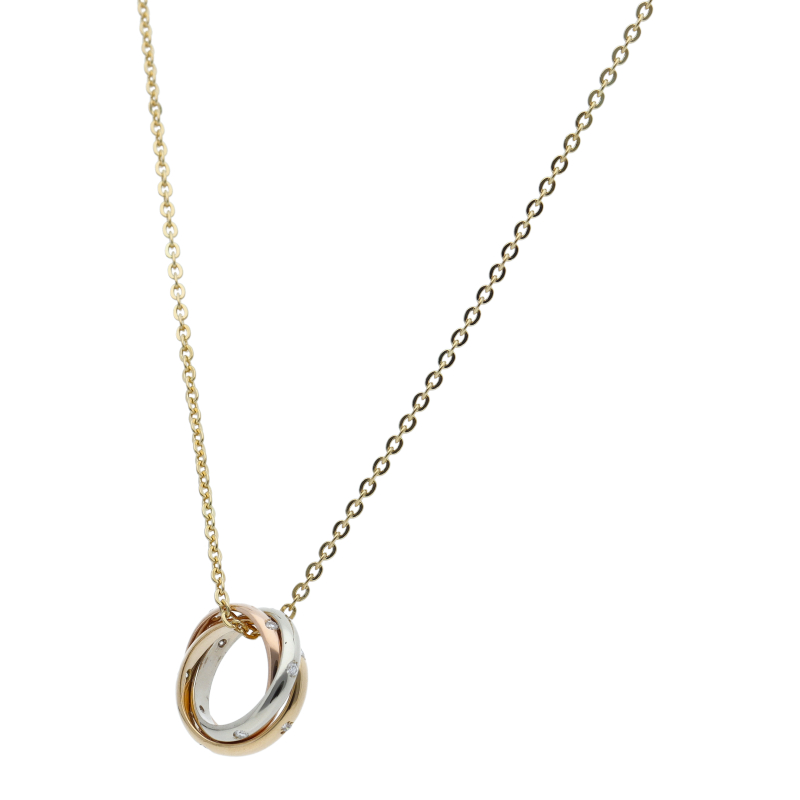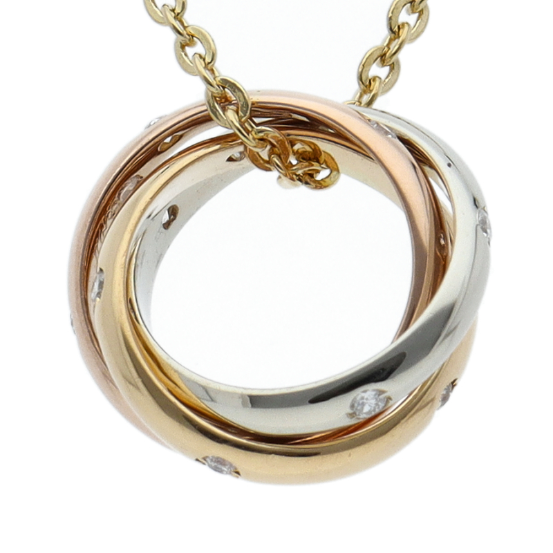 USED品。3カラー製。ピンクが愛、イエローが忠誠、ホワイトが友情を象徴します。独創的なデザインが、宇宙の神秘と永遠を宿すという意味が込められています。アクセントで15Pダイヤがあしらわれた豪華な商品です。