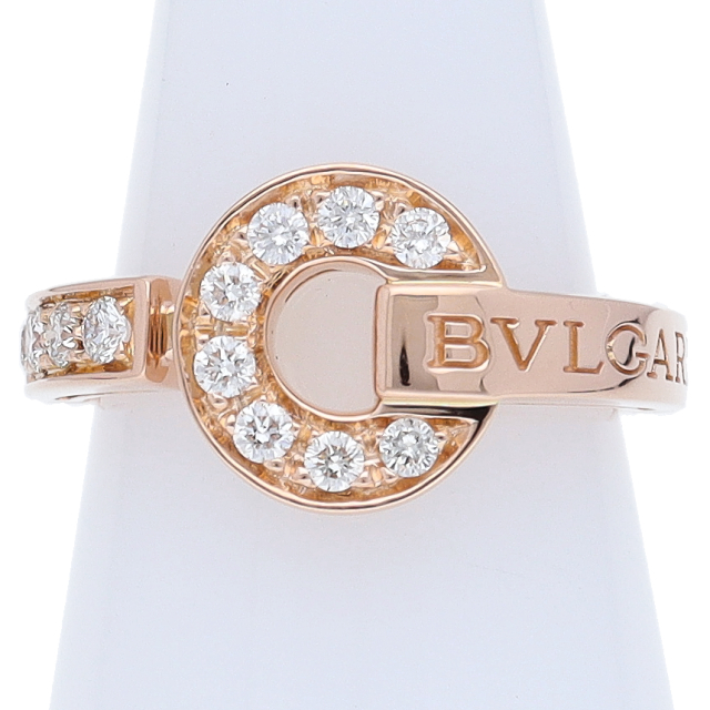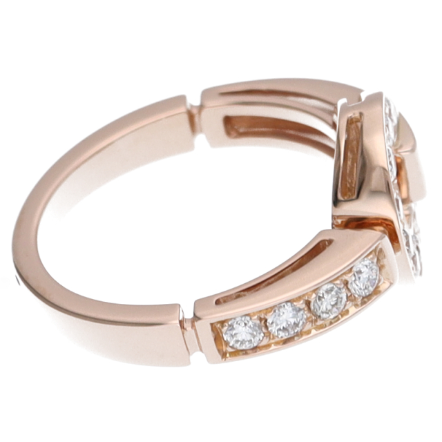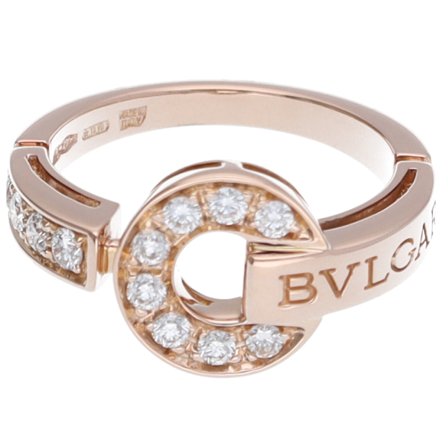 USED品。ピンクゴールド製。古代ローマのアンティークコインの文字から生まれた“BVLGARI”ロゴを上下ダブルで刻んだデザイン。ギリシャとローマ文化を取り入れたブルガリ人気のコレクションです。