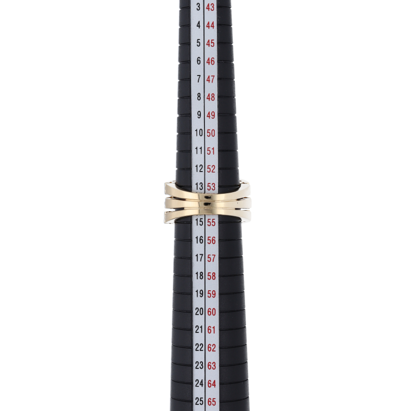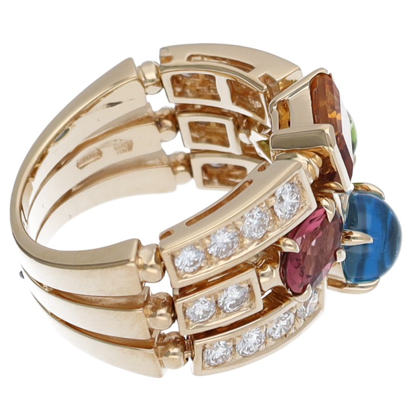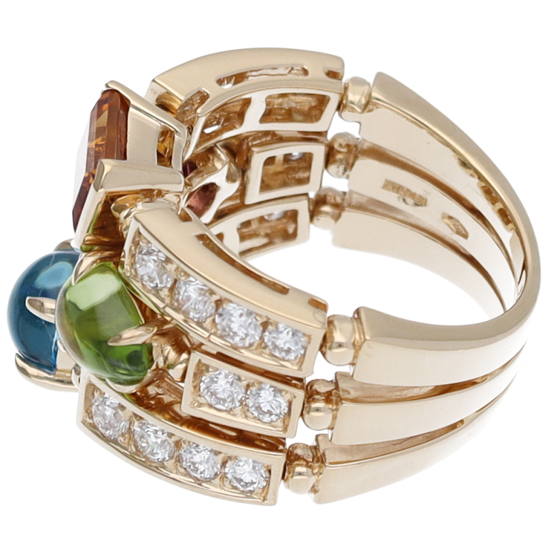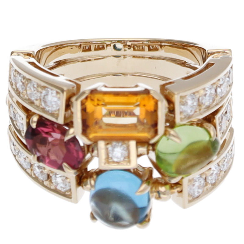 USED品。イエローゴールド製。ブルガリのカラージェムストーンが絶妙なバランスで配された華やかなリング。フロント部分が多少可動し、動きのあるデザインが斬新です。
