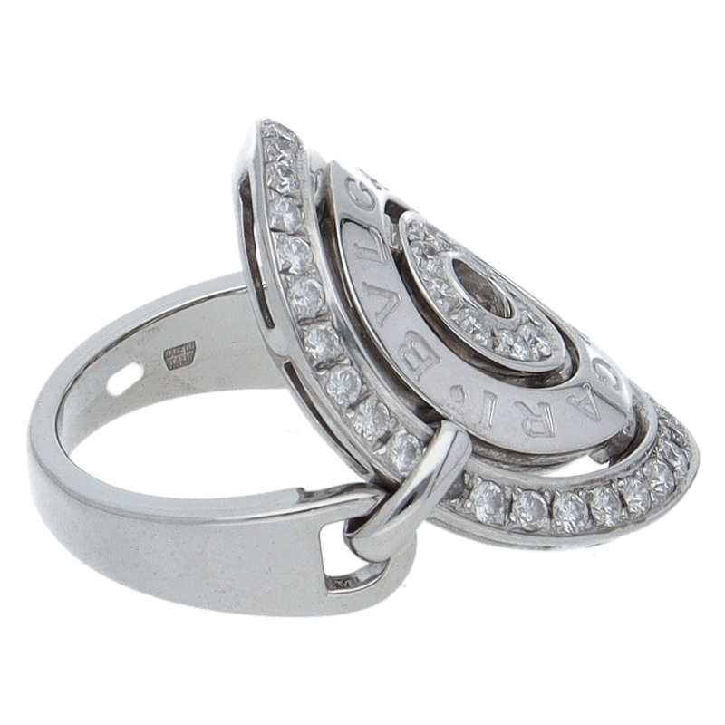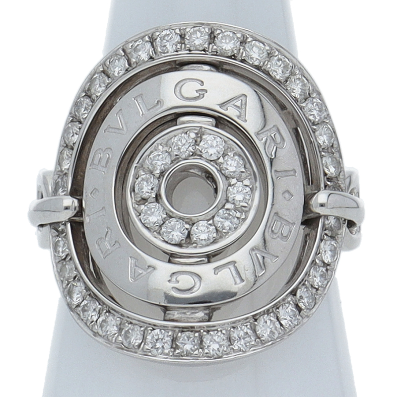 USED品。ホワイトゴールド製。存在感抜群の大ぶりなリング。個性的なデザインが存在感を際立たせます。