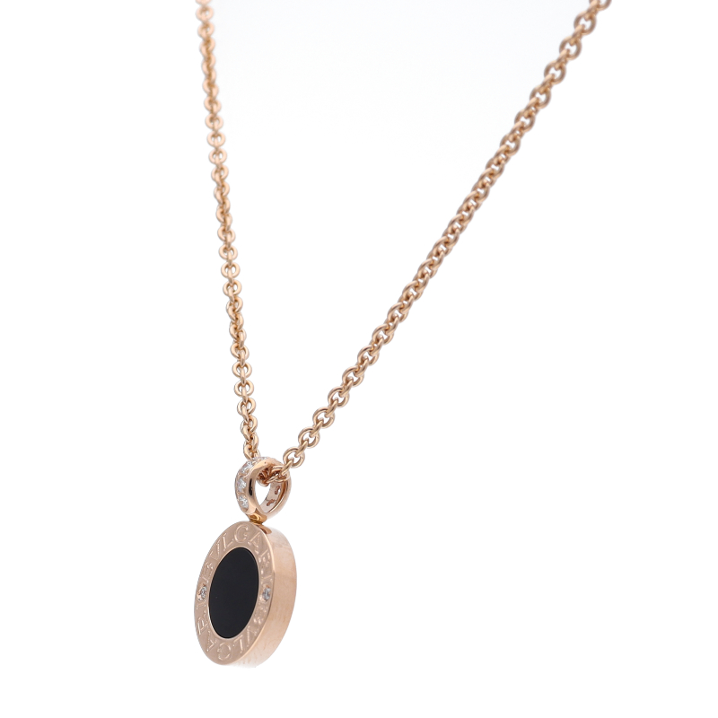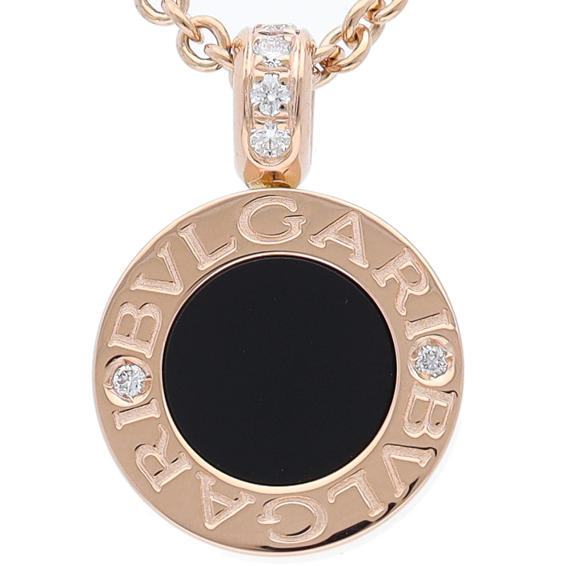USED品。ピンクゴールド製。ブルガリ・ブルガリのネックレスは、古代のコインに施された曲線的な文字からインスピレーションを得て誕生しました。今日このロゴは遊び心のある意外な進化を遂げ、特徴的なデザインエレメントを構成しています。
