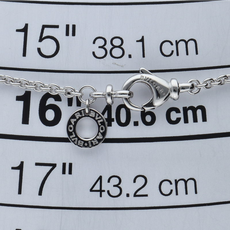 USED品。ホワイトゴールド製。古代ローマのアンティークコインの文字から生まれた“BVLGARI”ロゴを上下ダブルで刻んだデザイン。ギリシャとローマ文化を取り入れたブルガリ人気のコレクションです。