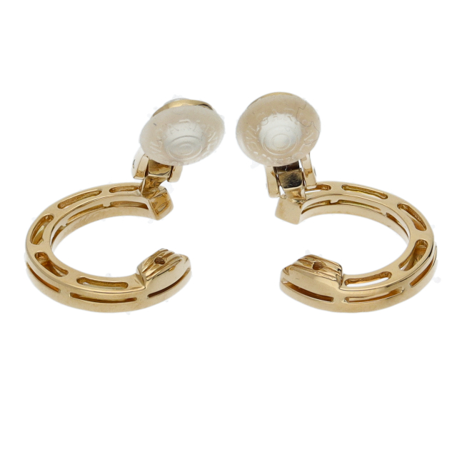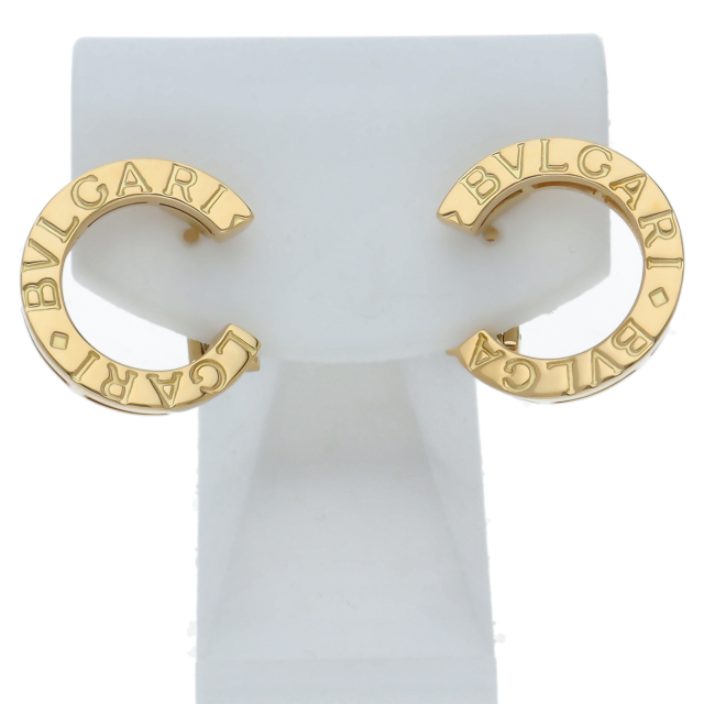 USED品。イエローゴールド製。アルファベットのCの様なデザインの中に「BVLGARI」の文字が入ったブルガリブルガリのイヤリングです。
