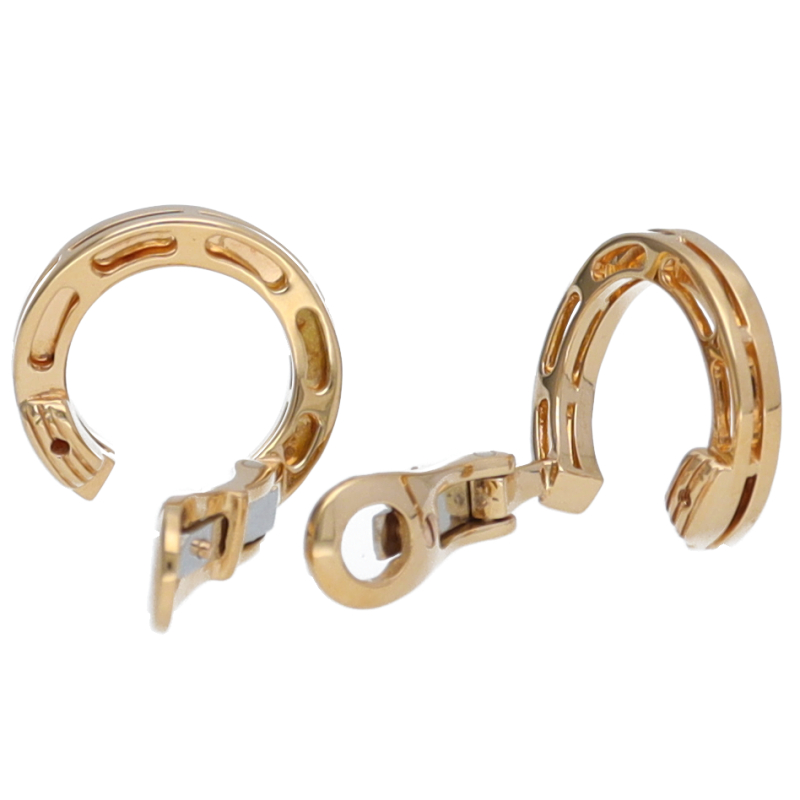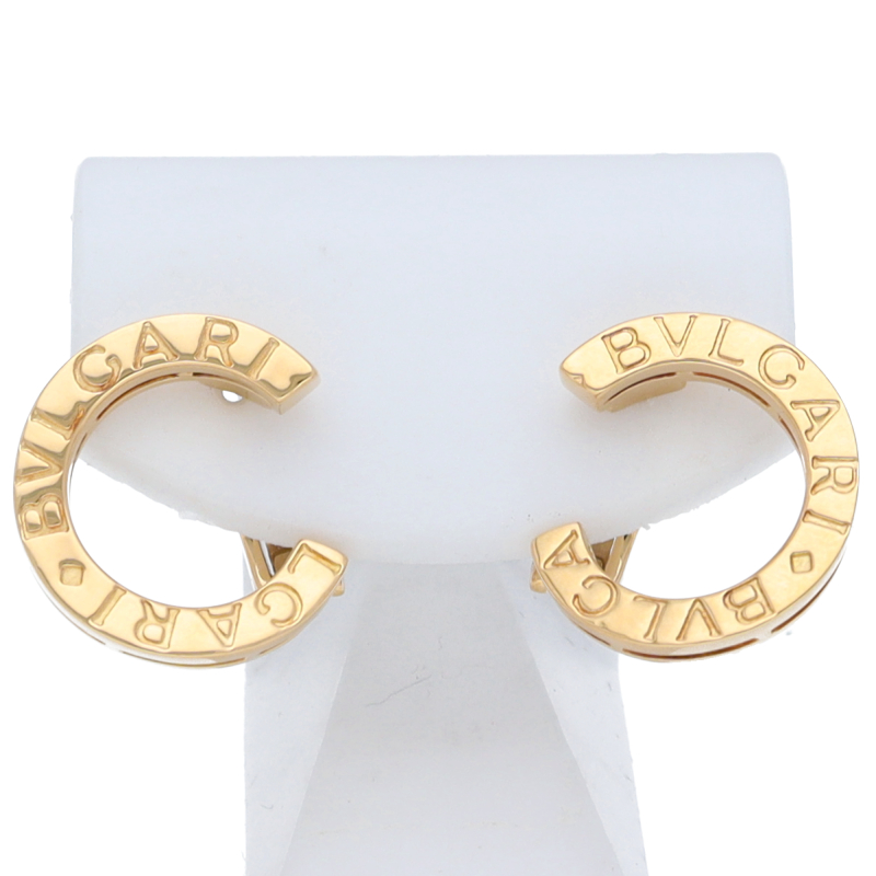 USED品。イエローゴールド製。アルファベットのCの様なデザインの中に「BVLGARI」の文字が入ったブルガリブルガリのイヤリングです。