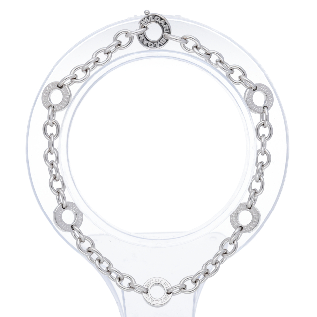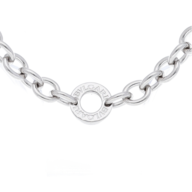 USED品。ホワイトゴールド製。古代ローマのアンティークコインの文字から生まれた“BVLGARI”ロゴを上下ダブルで刻んだデザイン。ギリシャとローマ文化を取り入れたブルガリ人気のコレクションです。