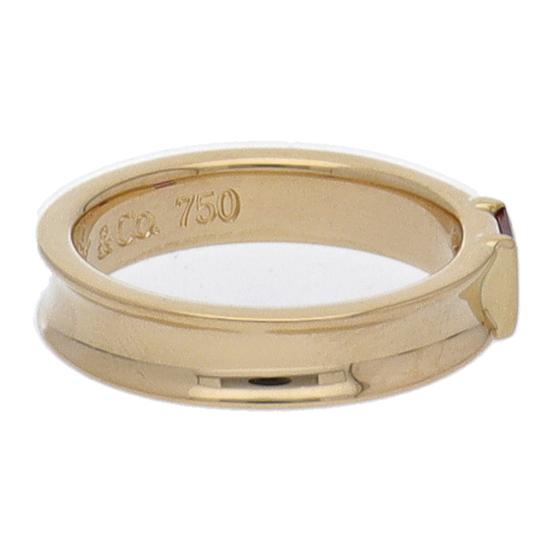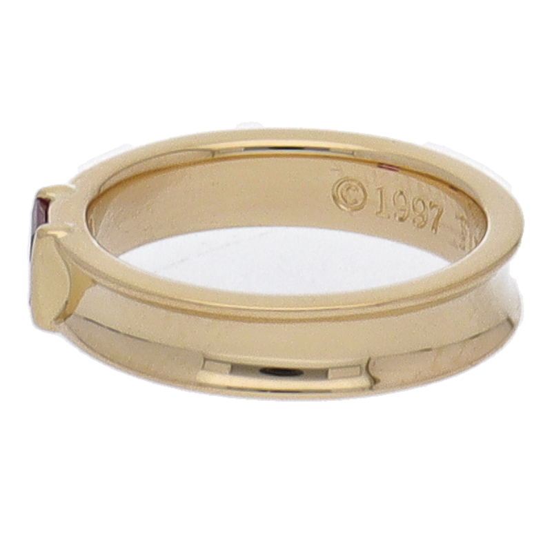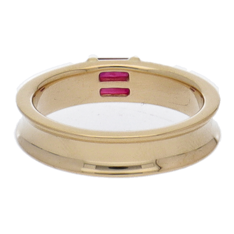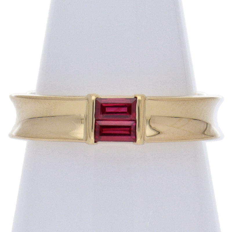 USED品。イエローゴールド製。バケットカットのルビーが2石配されたリング。シンプルな中にも上品な雰囲気が漂います。
