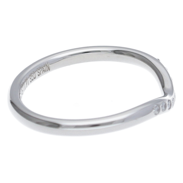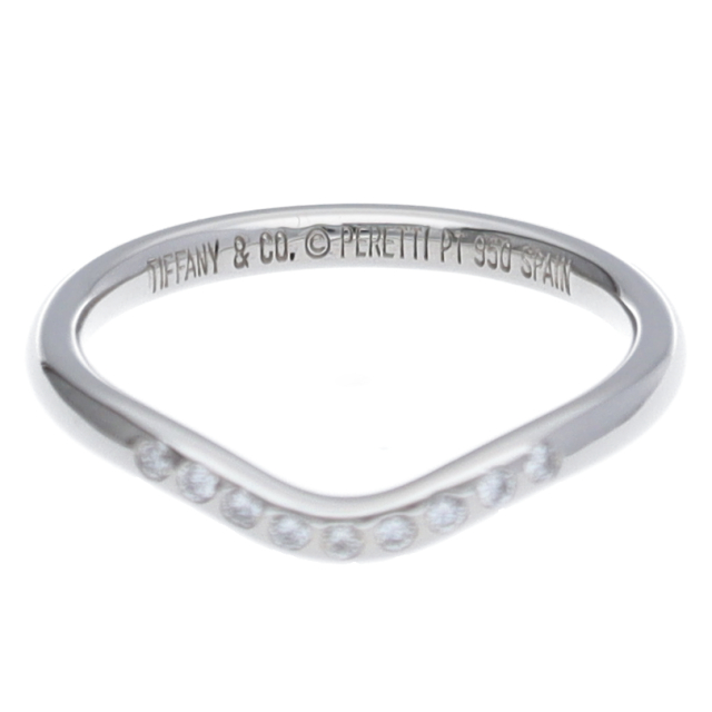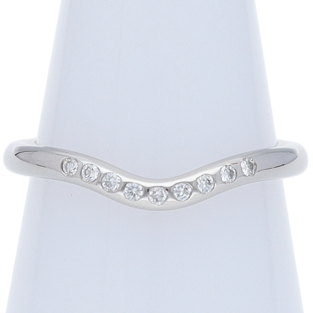 USED品。プラチナ製。ゆるやかなカーブが特徴的のリングです。シンプル過ぎず、個性を生かせるデザインになっています。9石入っているダイヤが煌きます。
