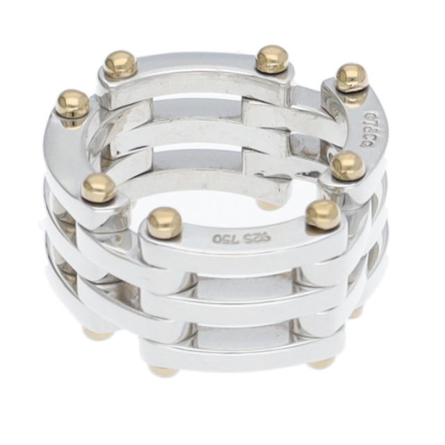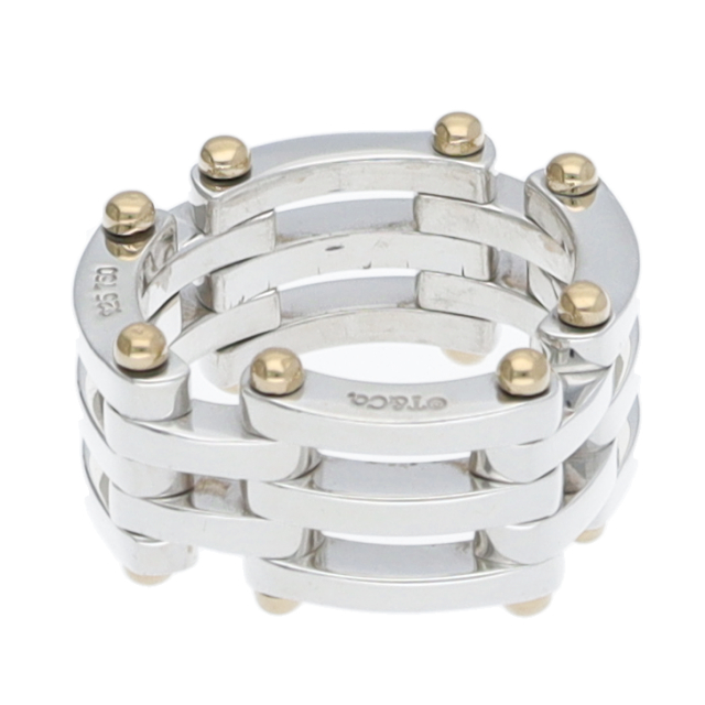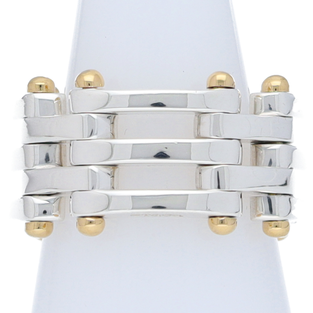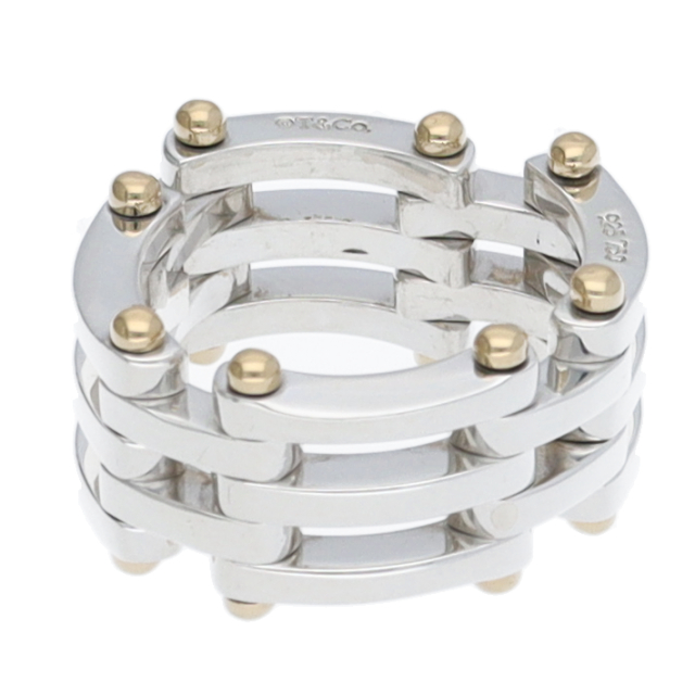 USED品。イエローゴールド/スターリングシルバー製。TIFFANYの廃盤になったモデルのゲートリング。シルバーとゴールドのコンビネーションが手元を華やかに演出。