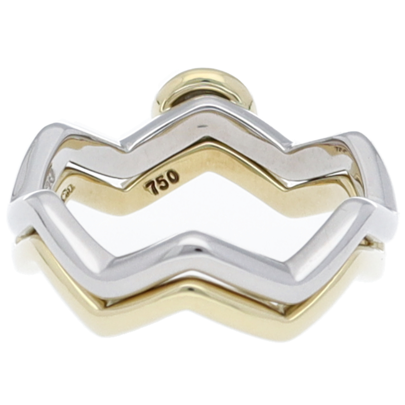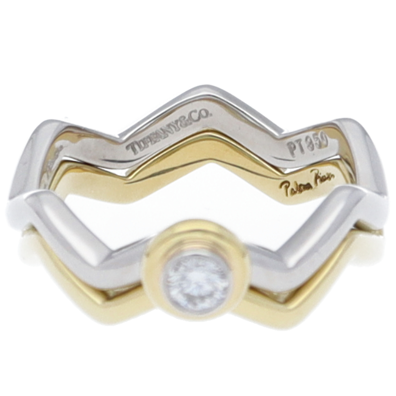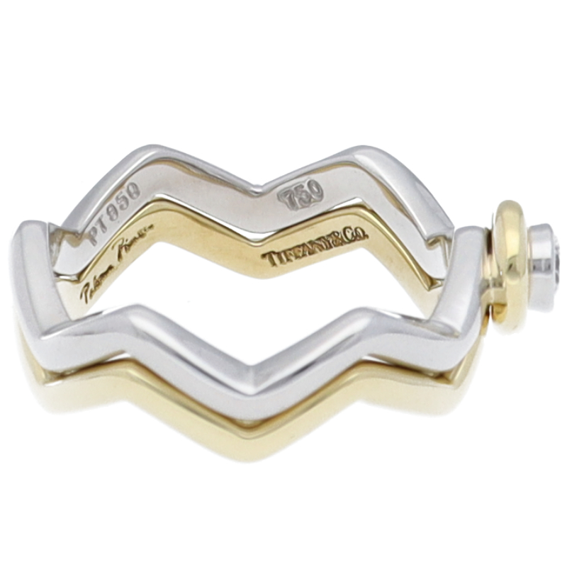 USED品。プラチナ/イエローゴールド製。ティファニーの定番人気「パロマ・ピカソ」シリーズのジグザグリングです。お得な2本セットですので、様々な付け方を楽しむことができます。