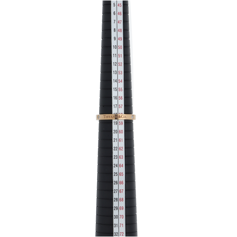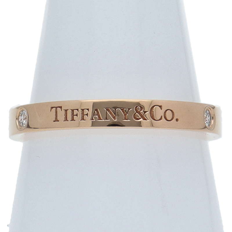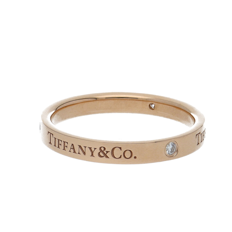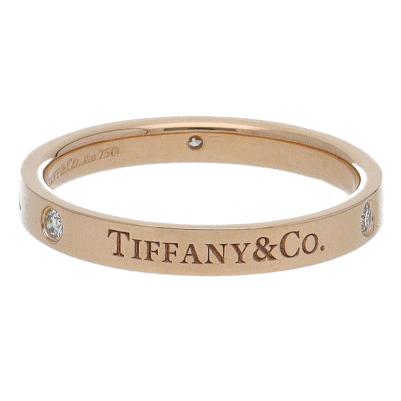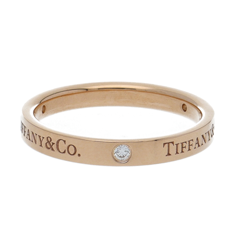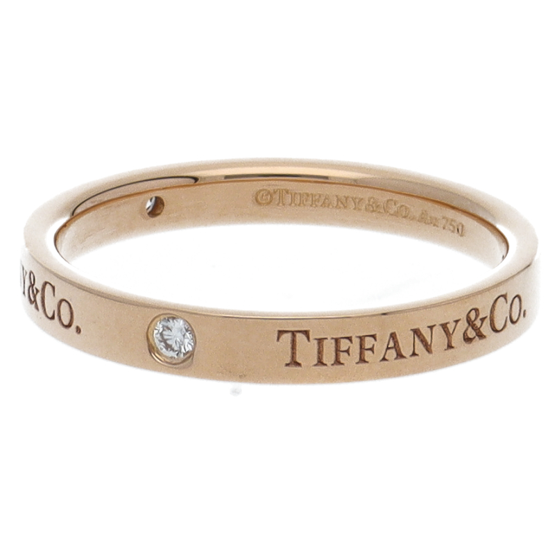 USED品。ピンクゴールド製。フラットな表面にティファニーのブランド名を刻印した、すっきりとした印象のリング。