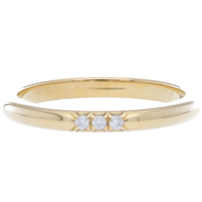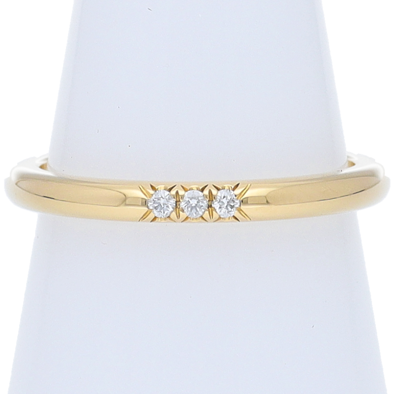 USED品。イエローゴールド製。シンプルなデザインと上質なダイヤモンド3石のみの、重ねづけでも1本でもエレガントに着用できる商品です。