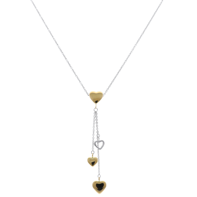 USED品。イエローゴールド製。メインのハートモチーフから垂れ下がる、3つのハートモチーフが魅力的なネックレスです。大小様々なイエローゴールドのハートモチーフと、オープンワークのホワイトゴールドがアクセントになっています。
