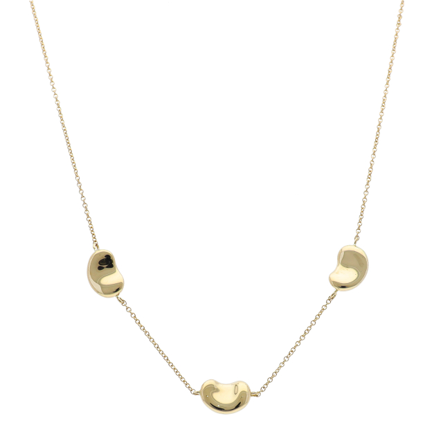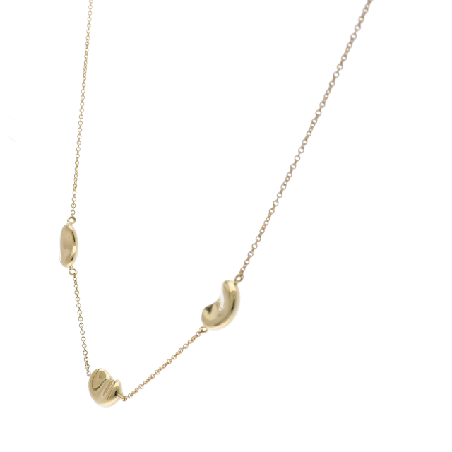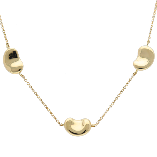 USED品。イエローゴールド製。丸みを帯びたティファニーのビーンズネックレス。大粒のデザインで、輝きの良い一品です。