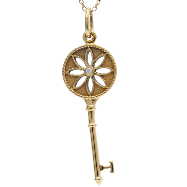 USED品。イエローゴールド製。人気のキーをモチーフにしたペンダント。中央にダイヤが1粒セッティングされた、フェミニンで華やかな印象のネックレスです。