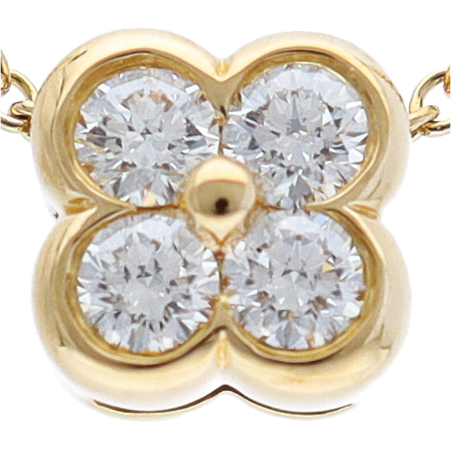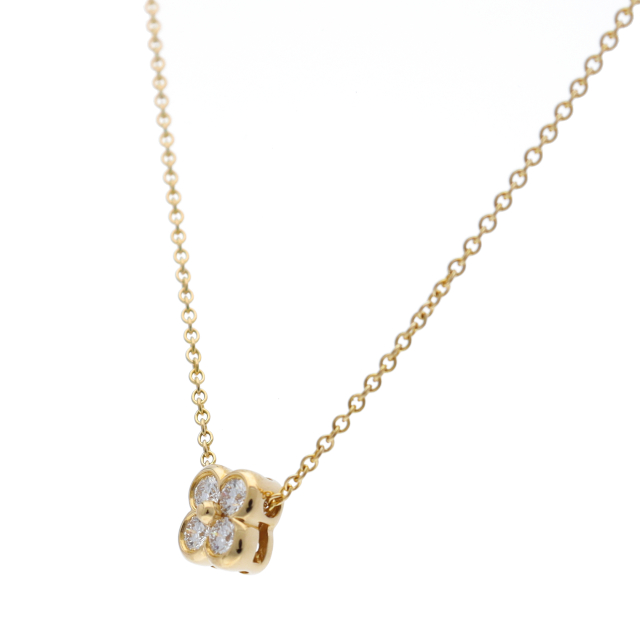 USED品。イエローゴールド製。花をかたどった、ボリューム感たっぷりの4石ダイヤが首元を鮮やかに彩る商品です。