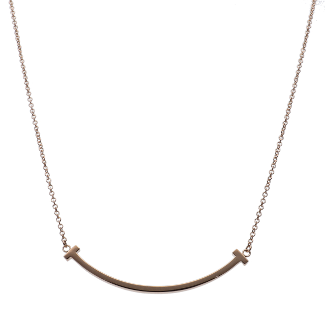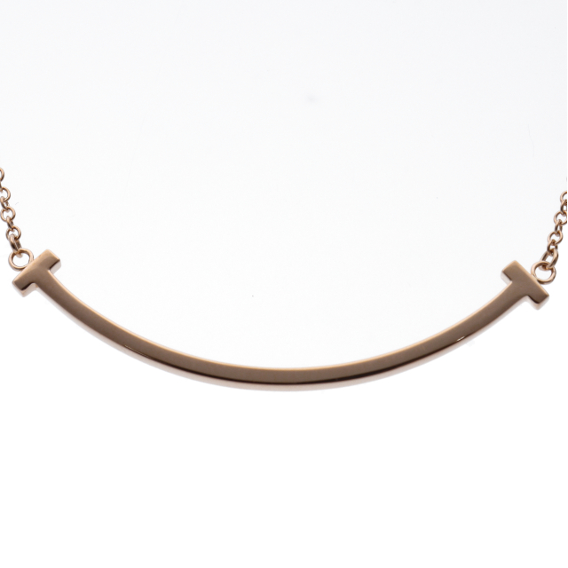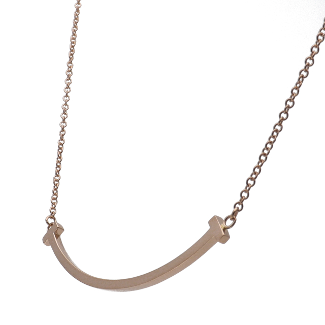 USED品。ピンクゴールド製。人気のTスマイルモチーフを控えめなサイズでデザインした上品なアイテムです。シンプルながらもコーディネートに気品を添えてくれる一品です。