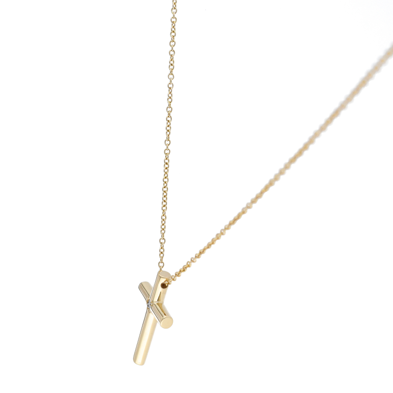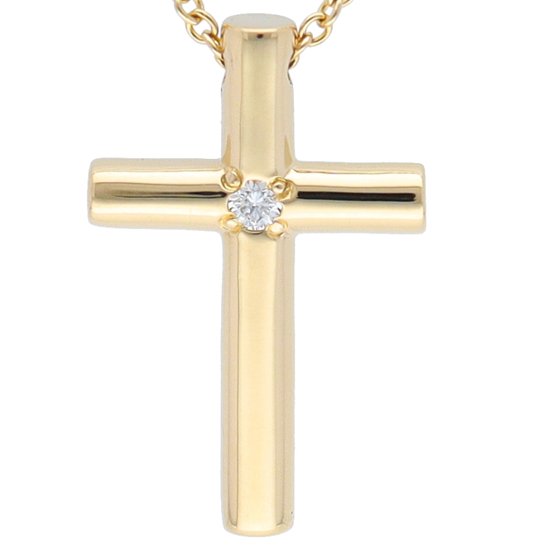 USED品。イエローゴールド製。シンプルで飽きの来ないクロスモチーフのネックレスに1Pダイヤが埋め込まれたオシャレなネックレスです。