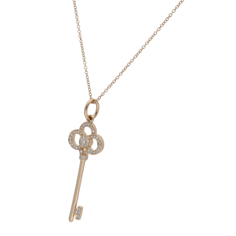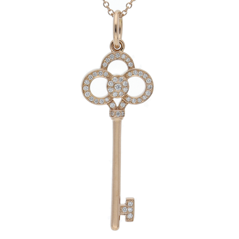 USED品。ピンクゴールド製。希望と前向きな生き方を映し出す光り輝く灯火のように、喜びに満ちた明るい未来を象徴するティファニー キー。燦然と輝くダイヤモンドが、時代を超えたエレガンスを思わせるネックレスです。