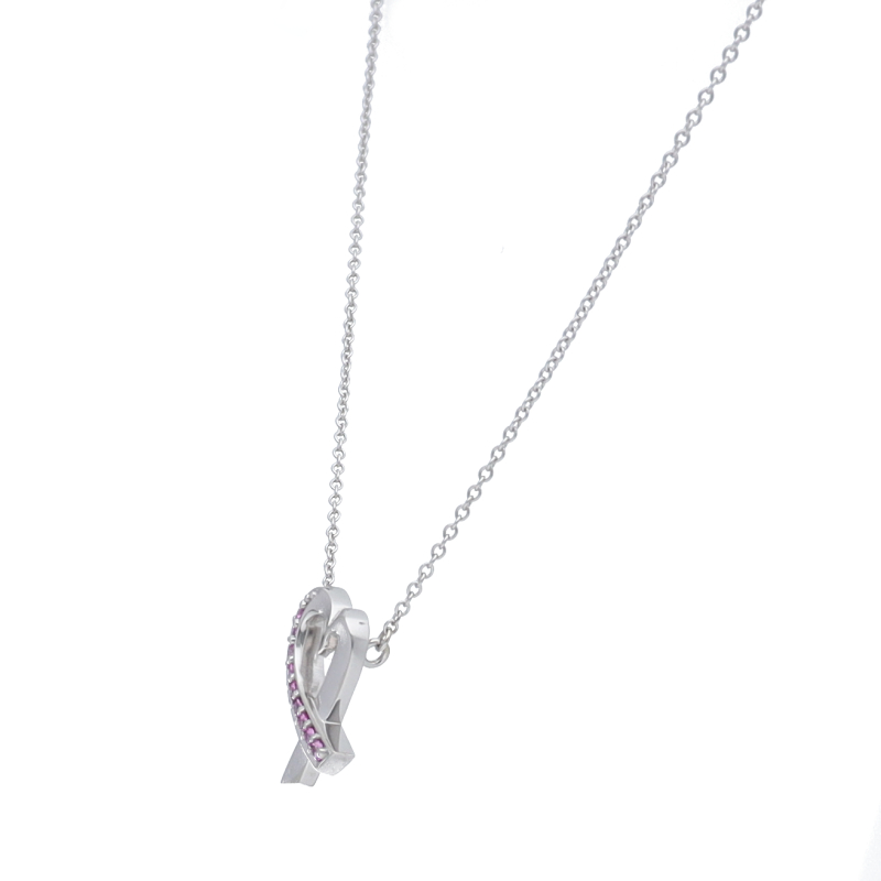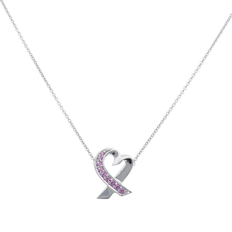 USED品。ホワイトゴールド製。パロマピカソデザインのハートモチーフのネックレス。小ぶりのサイズが可愛らしくピンクサファイアがゴージャスな印象です。