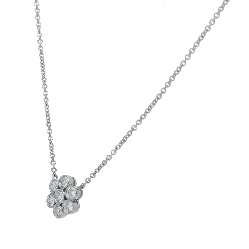 USED品。プラチナ製。フラワーモチーフにダイヤモンドがセッティングされたネックレスです。上質なダイヤモンドの輝きが、女性らしさを演出してくれる逸品です。