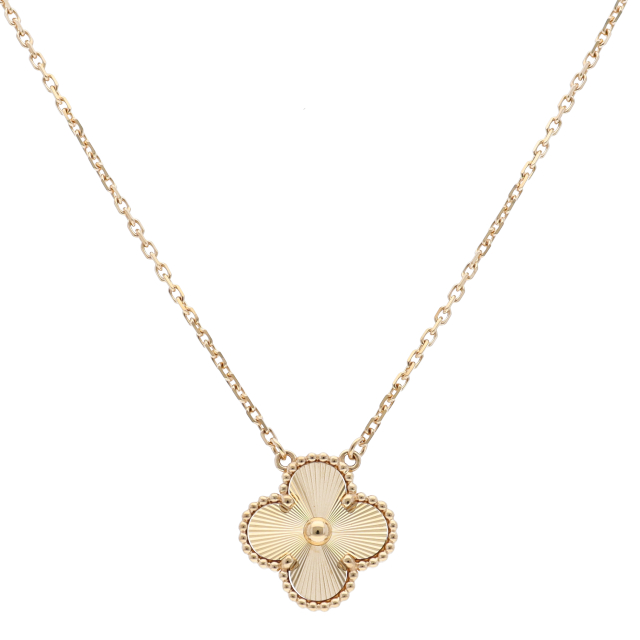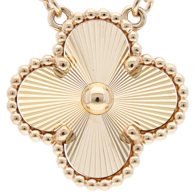 USED品。イエローゴールド製。1968年に初めて誕生したアルハンブラの特徴を受け継ぎ、ヴァン クリーフ&アーペルならではの独創性と時を超えるエレガンスを湛えるヴィンテージ アルハンブラ。ゴールドビーズによる縁取りが美しい、四つ葉のクローバーに着想を得た幸運のシンボルです。ギョーシェ彫りの素敵なデザインとなります。