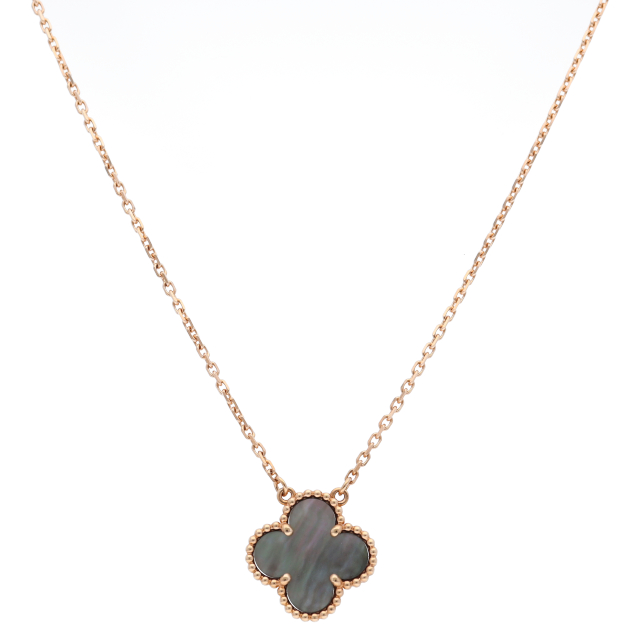 USED品。ピンクゴールド製。象徴的なアルハンブラモチーフに忠実なデザインです。こちらはグレーのマザーオブパールとローズゴールドの組み合わせです。