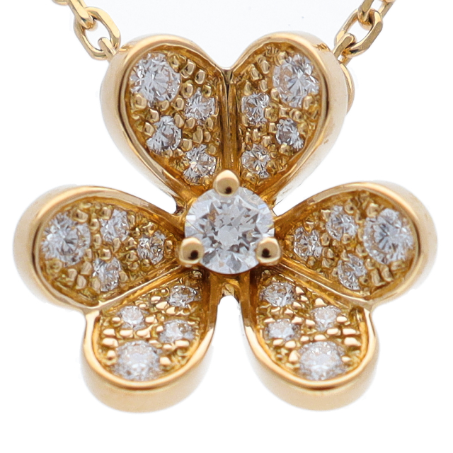 USED品。イエローゴールド製。ハートが寄り添ってクローバーを形作るヴァンクリーフ&アーペルの フリヴォルコレクション。ハート型の花びらにダイヤモンドが散りばめられ豪華に貴方の胸元を飾る魅惑のジュエリーです。