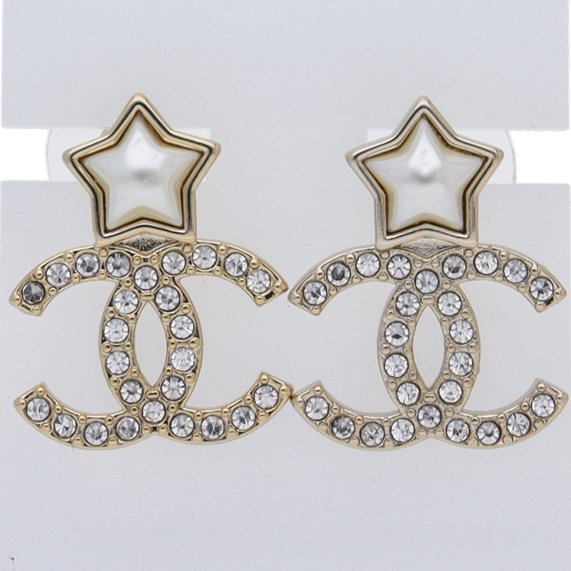 USED品。シャネルのココマークのブランドアピールばっちりのピアス。ラインストーンとコスチュームパールがアクセントになっており、、非常に上品なデザインのシャネルのピアスです。