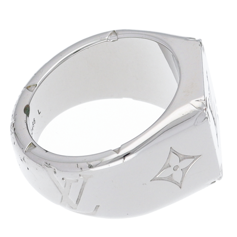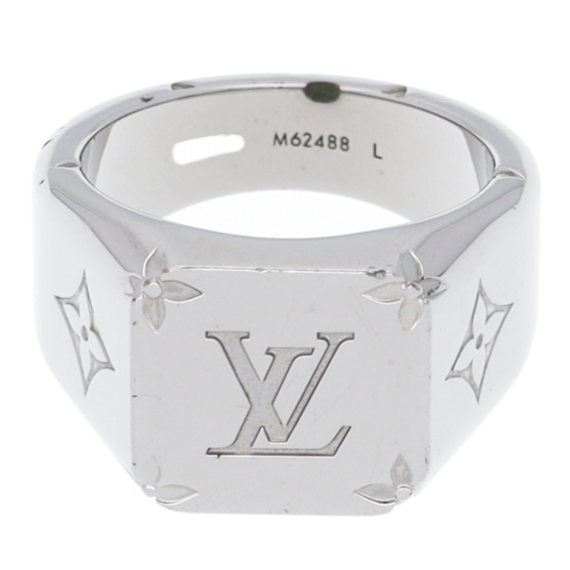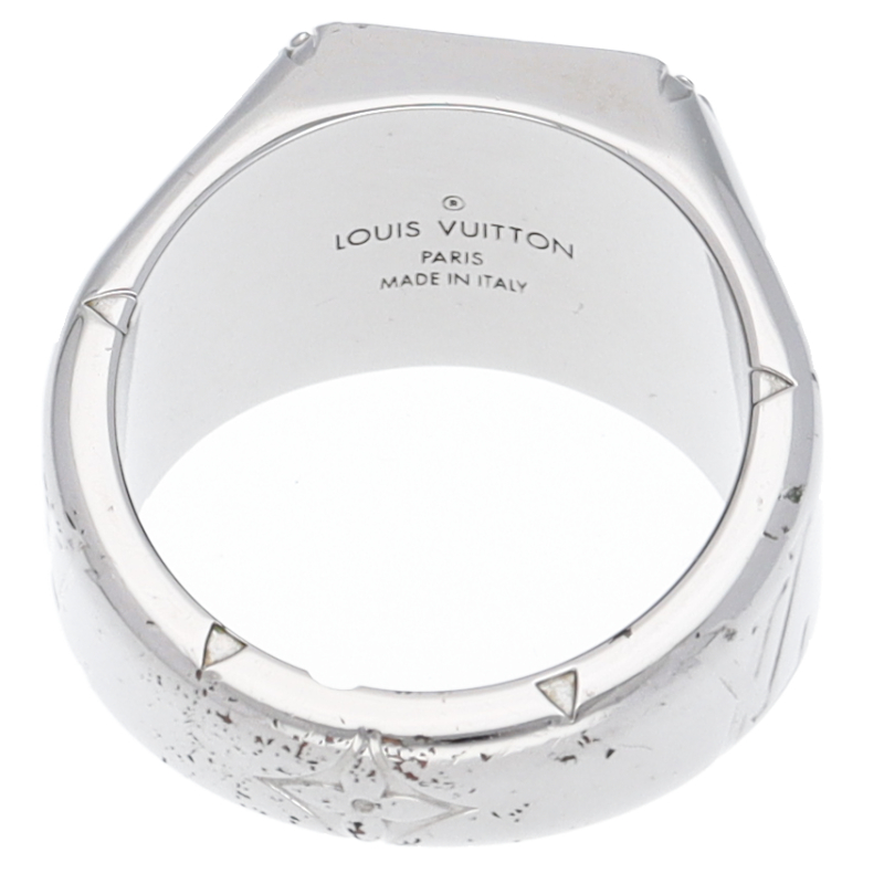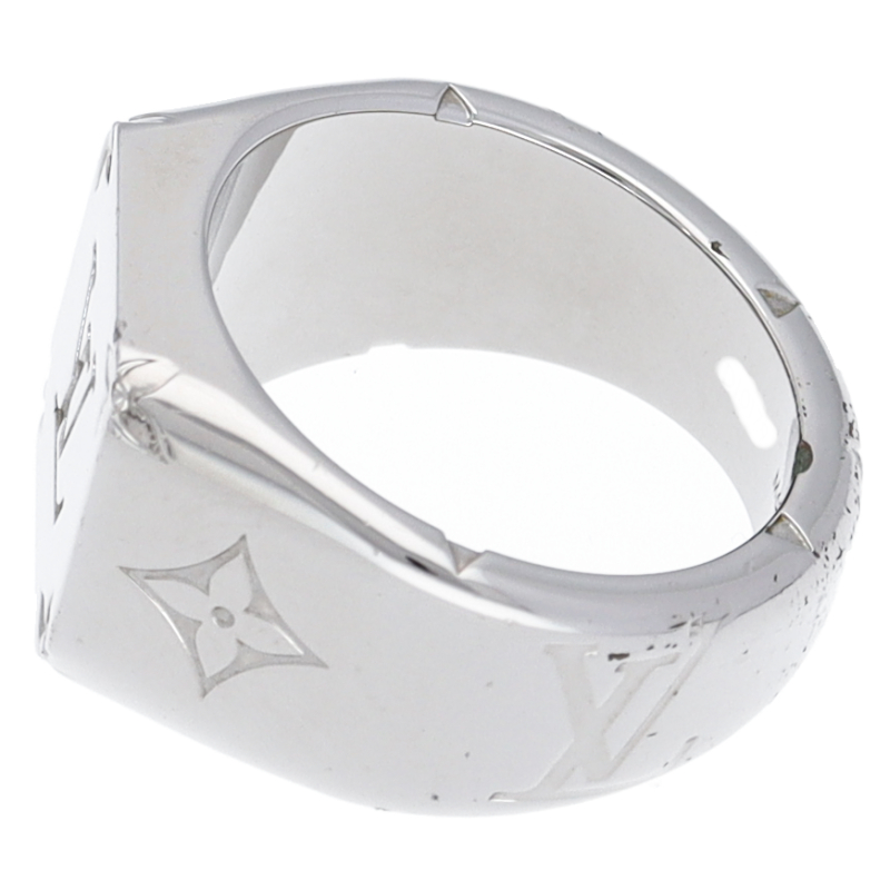 USED品。細かく彫刻されたモノグラム・パターンに光沢感のあるシルバーカラーの仕上げを施した「シグネットリング モノグラム」。力強いデザインでマスキュリンな装いを演出するリングは紳士の日常のワードローブに欠かせないアイテムです。