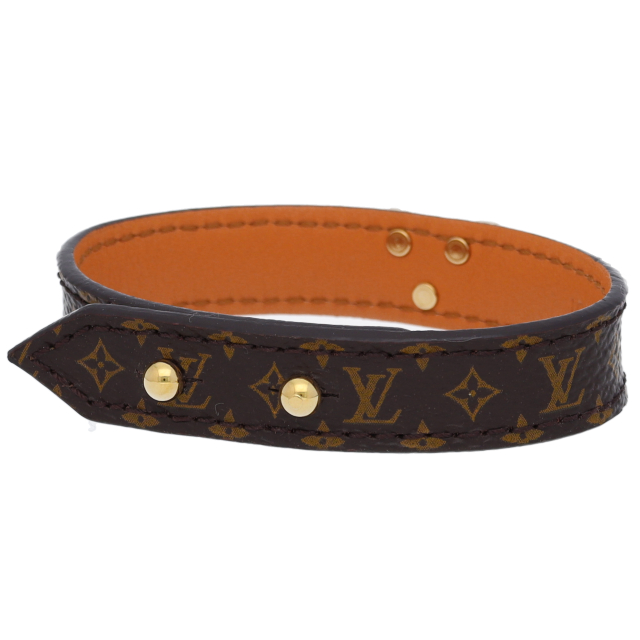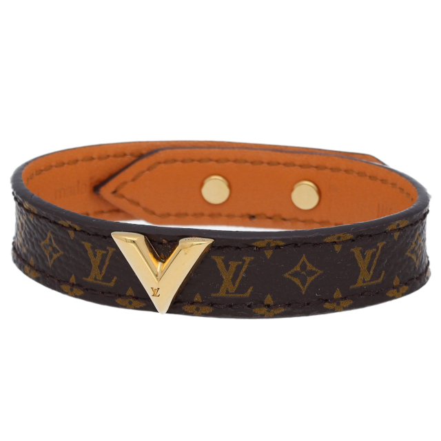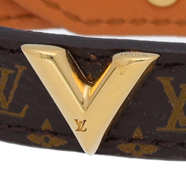 USED品。レザーブレスレットに「V」シグネチャーが施された今までにないデザインの「ブレスレット・エセンシャル V」。タイムレスなモノグラム・キャンバスを幾何学的で大胆なデザインに仕上げた、日常使いに最適なアイテムです。