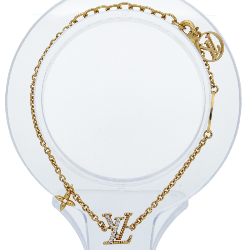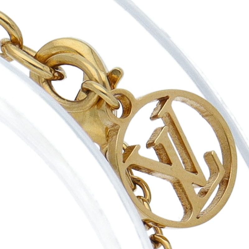 USED品。メゾンの卓越したシンボルをカジュアルな装いに取入れたブレスレット「ブレスレット・LV アイコニック」。煌めくストラスを散りばめたLV イニシャル、小ぶりのモノグラム・フラワー モチーフ、繊細な刻印を施したプレートをあしらいました。背面の調節可能なチェーンに添えたLV サークルのチャームがメゾンならではの個性をプラスします。