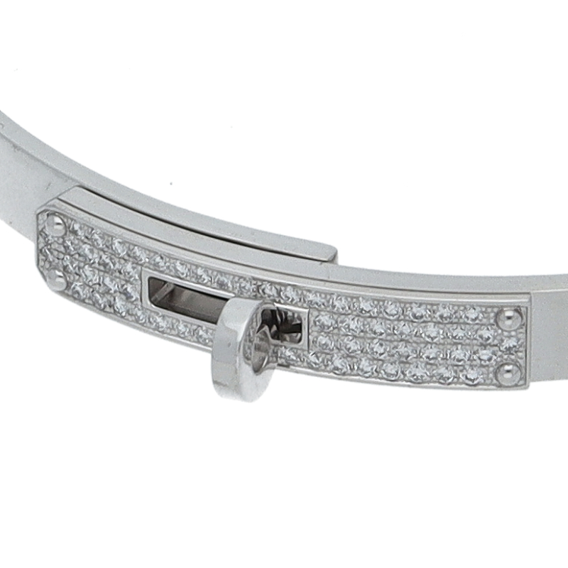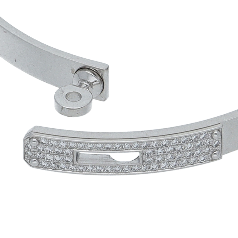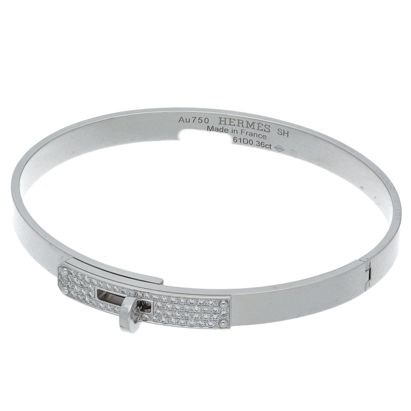USED品。エルメスの代表的なデザインの一つであるケリーバッグのモチーフをあしらったバングルとなります。61石0.36ctのダイヤモンドが高級感を際立たせております。
