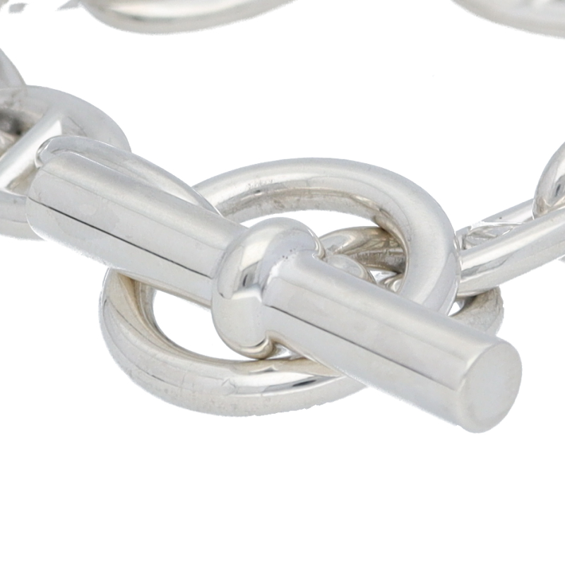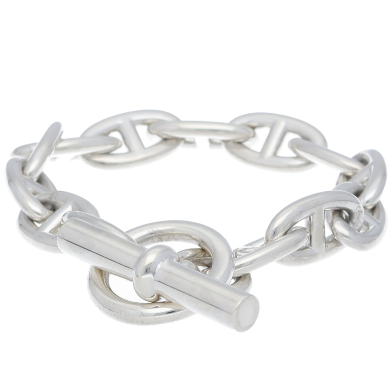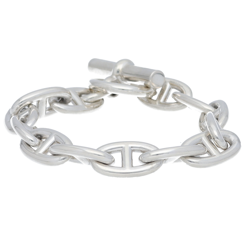 USED品。スターリングシルバー製。オーバル型のチェーンが個性的なシェーヌダンクルブレスレット。 シンプルでどんなスタイルにも合わせやすいのが魅力です。人気アーティストなどの芸能人がこぞってSNSに投稿したことをきっかけに、2020年夏ごろから知名度と人気が一気に高まっていてブティックでも予約待ちの商品です。