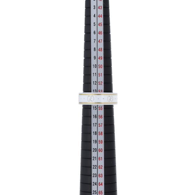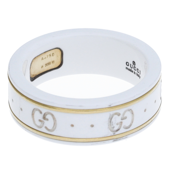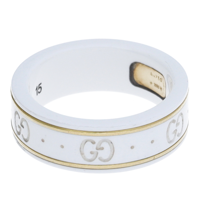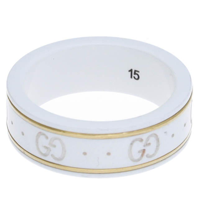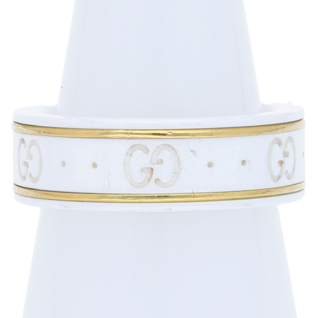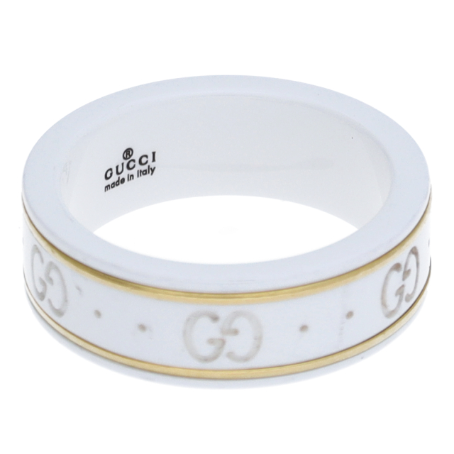 USED品。イエローゴールド/セラミック製。グッチを象徴するGGロゴを刻んだアイコンリングです。シンプルなデザインで使いやすいリングです。