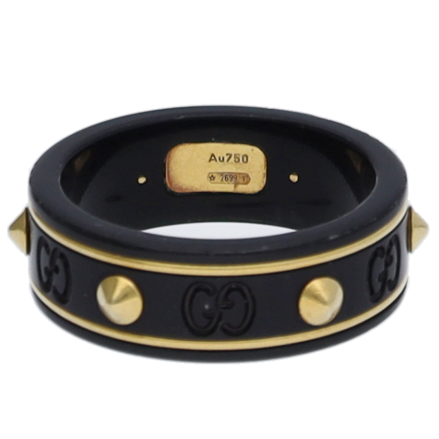 USED品。GGアイコンが等間隔にエンボスされているデザインで、ふちにさりげなく入ったゴールドが漆黒のカラーを引き立ててくれます。