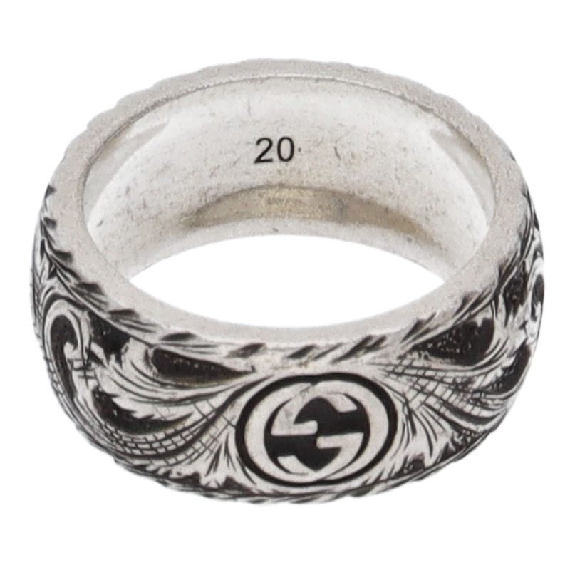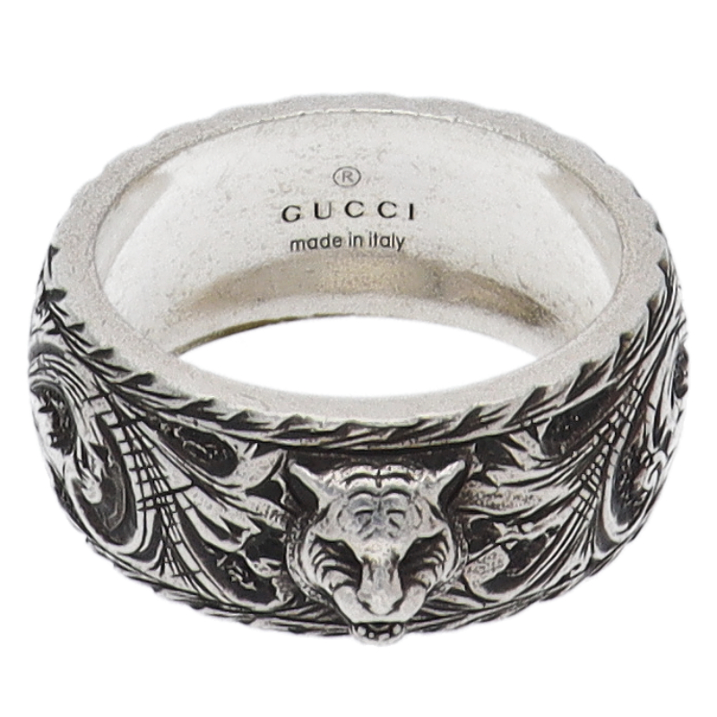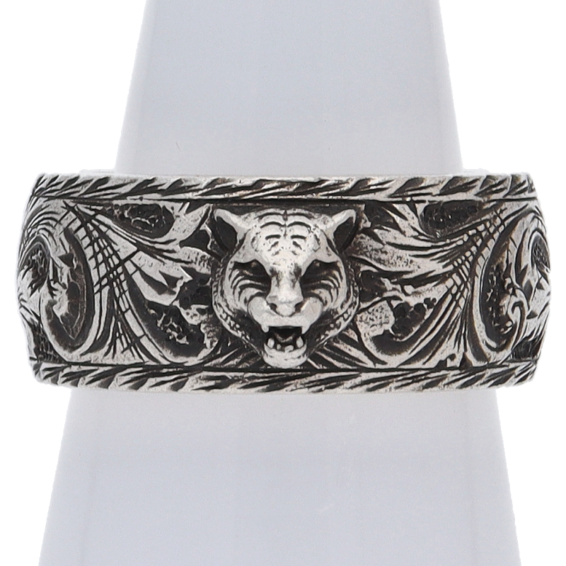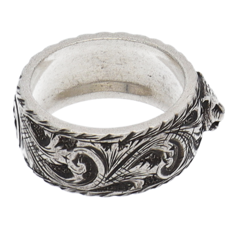 USED品。スターリングシルバー製。趣あるアラベスク模様にワイルドなキャットヘッドをプラス。クールでありながら存在感のある佇まいで、男女問わず身につけて頂けます。