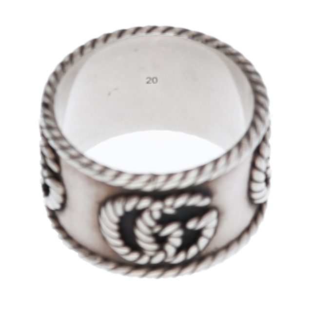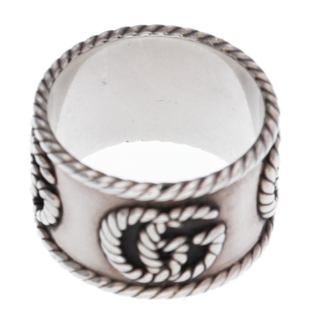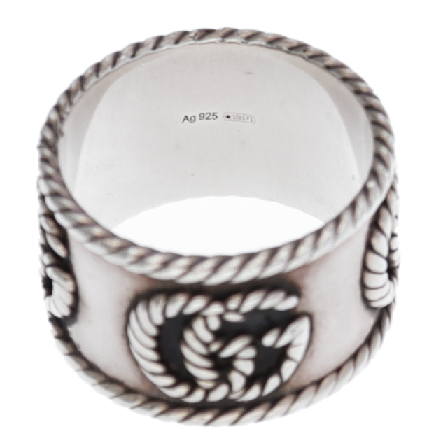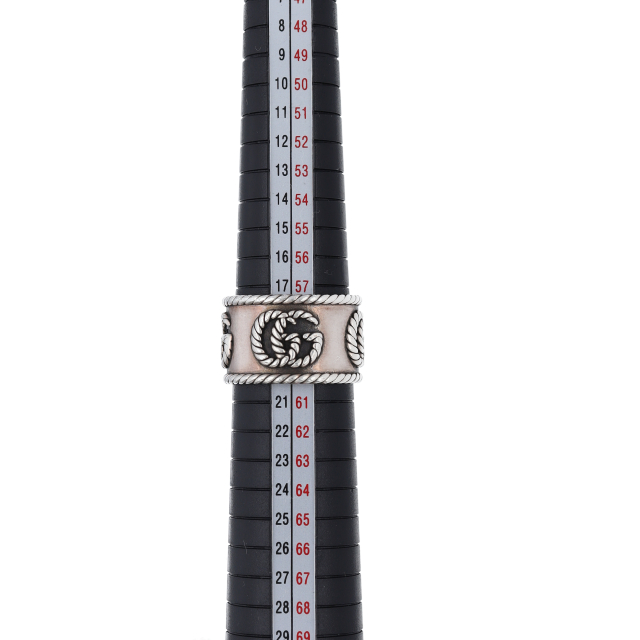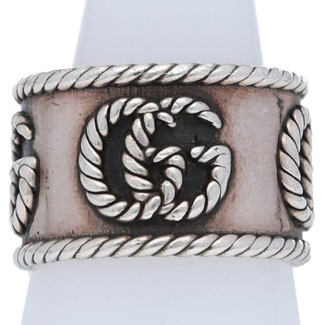 USED品。スターリングシルバー製。グッチを象徴するダブルGをツイスト トーション デザインで表現した、スターリングシルバーのスリムリング。卓越したクラフトマンシップと繊細なデザインでブランドをさりげなく表現するグッチのシルバージュエリー コレクションは、コンテンポラリーからクラシックまでさまざまなアイテムを展開しています。