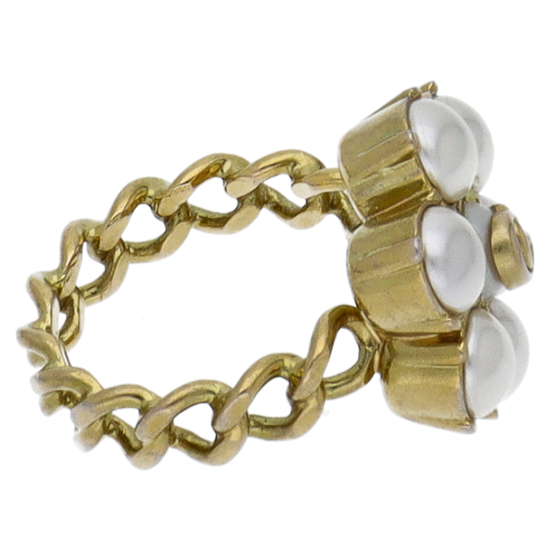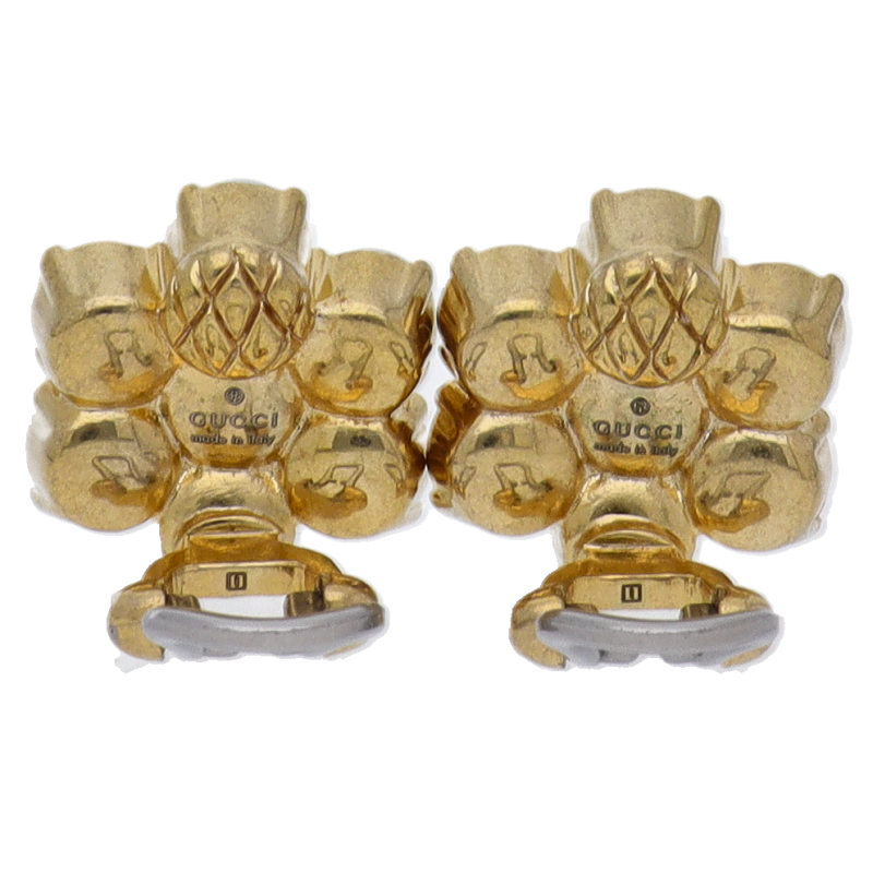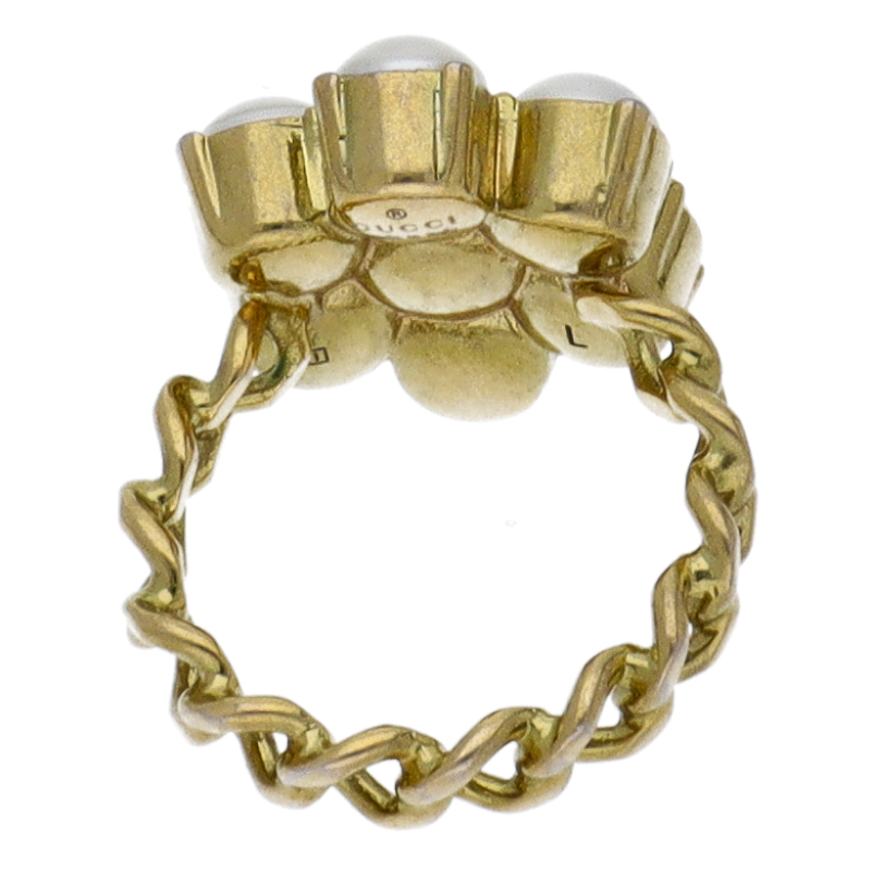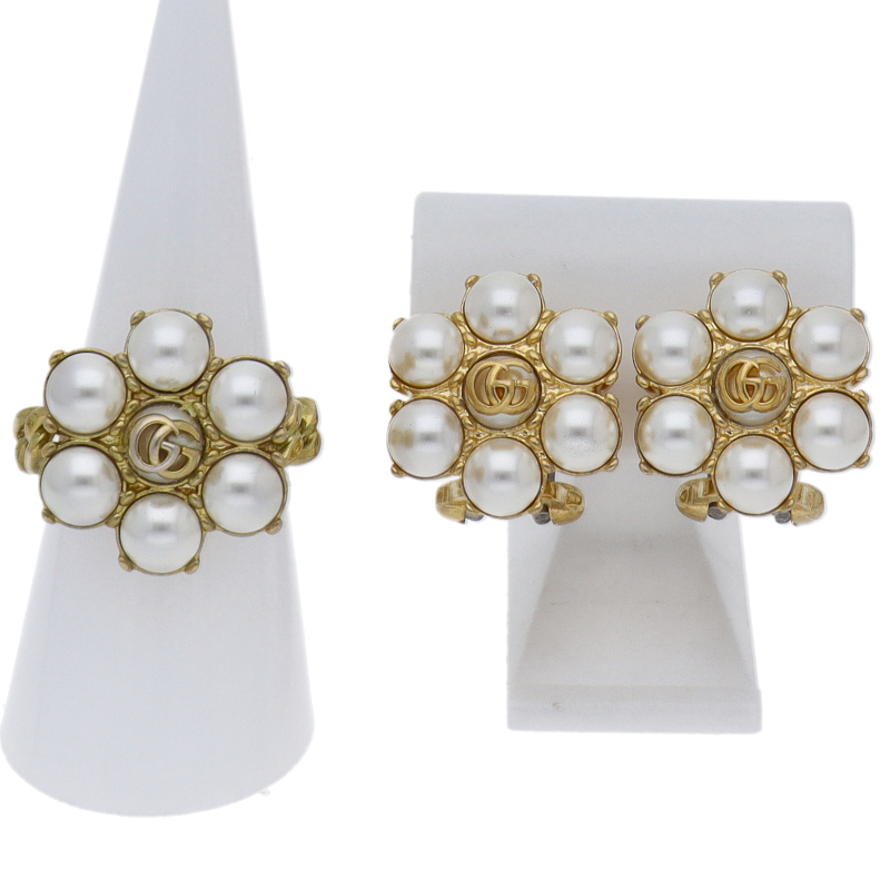 USED品。ブランドの創設者グッチオ・グッチのイニシャルを表すダブルGをモチーフとしたリングとイヤリング。ダブルGの周りをフェイクパールで花の形に囲み、レトロ感を演出しています。