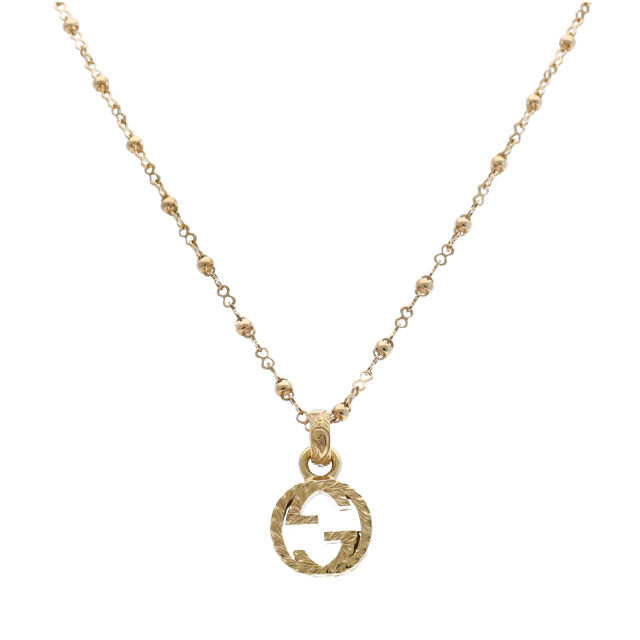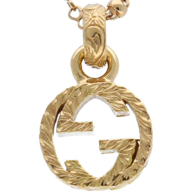 USED品。イエローゴールド製。パターンがエングレービングされたスターリングシルバーのインターロッキングG ペンダント付き テクスチャードチェーン。