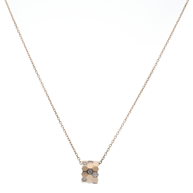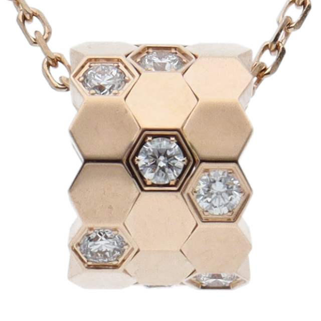 USED品。ピンクゴールド製。ローズクォーツをラウンドカボションカットに仕上げ、底の鏡面仕上げが美しさを引き立てます。遊び心あふれる、洗練されたデザインが美しい、ショーメのネックレスです。