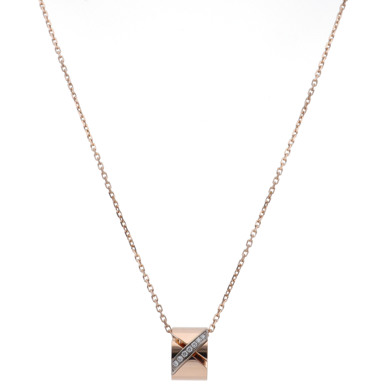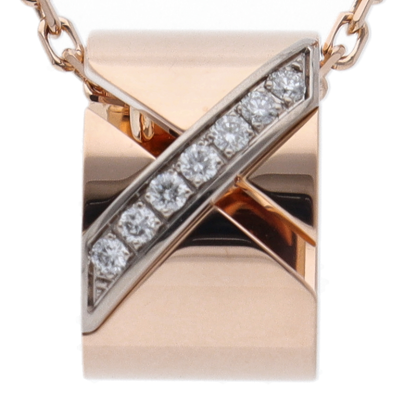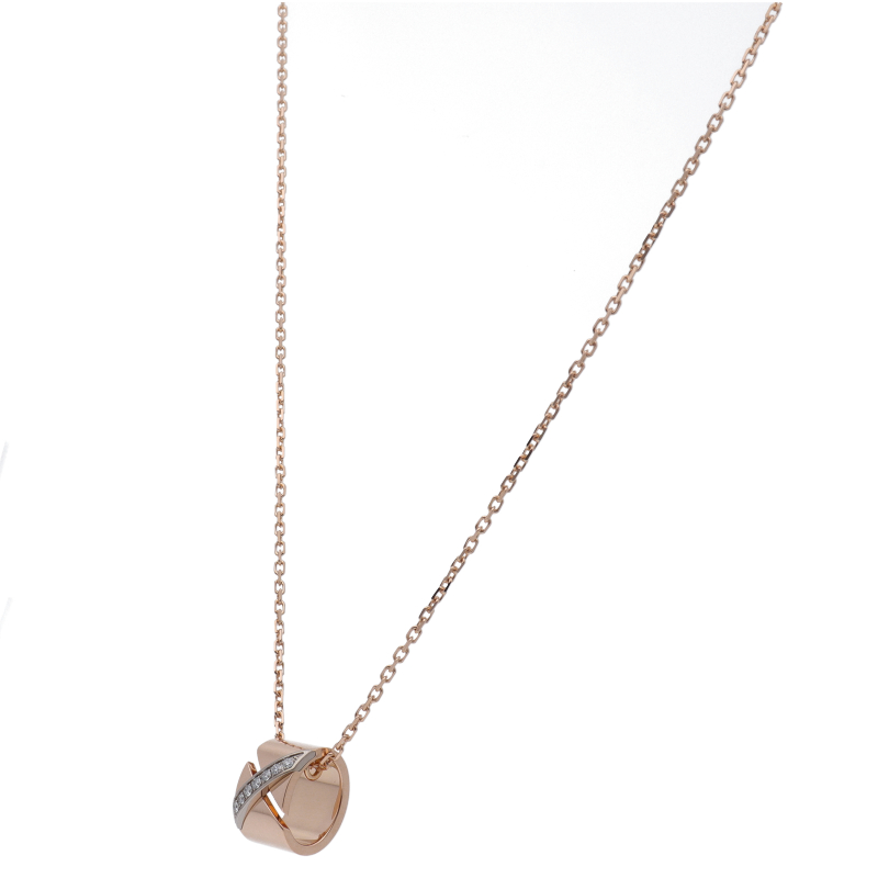USED品。ピンクゴールド製。ユニセックス仕様の「リアン エヴィダンス」ペンダントは、洗練された印象のグラフィカルなデザインと滑らかなシェイプが目を惹くデザインです。運命的な二人の結び付きをイメージした結び目のクロスモチーフが人間関係の力強さを表現します。
