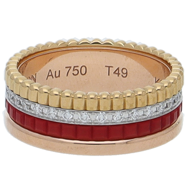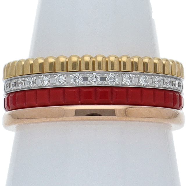 USED品。3カラー製。世界屈指の技術を楽しめるのが「キャトル」です。「キャトル」とは、フランス語で“4”を意味します。アイコニック コレクションのデザインを踏襲したキャトル レッド リング。 3種のゴールドとダイヤモンドを組み合わせと独自のレッドセラミックが鮮やかなモデルです。