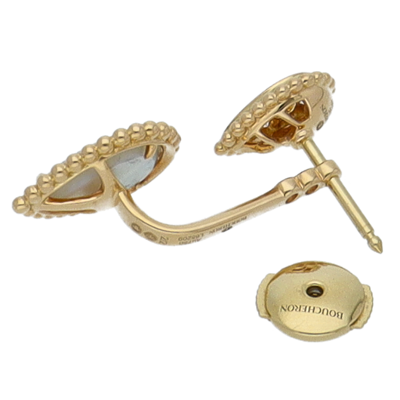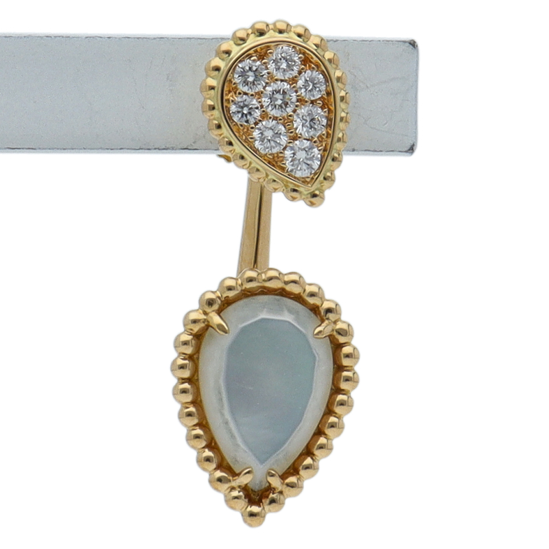 USED品。イエローゴールド製。スネークの神秘的な美しさを表現したセルパンボエム。自由に着け方を楽しめるこのイヤリングは、マザーオブパールが施されたドロップモチーフのパーツを取り外すことで、シンプルなダイヤモンドのスタッズイヤリングとして着用することができます。