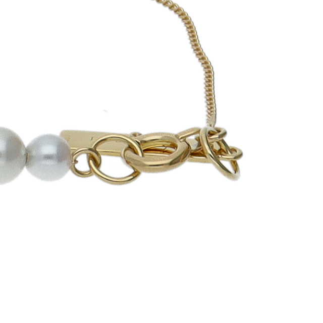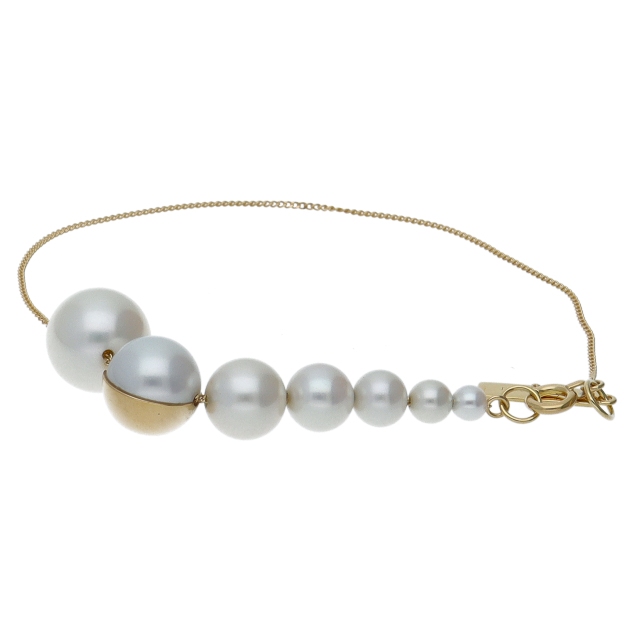 USED品。サイズの異なるパールのグラデーションで貝殻のオーガニックなフォルムを表現した「シェル」。ボリューム感のあるパールのセッティングで、手元をリッチに演出します。イエローゴールドをまとわせた1珠のパールがアクセントとなった、タイムレスなデザインのブレスレットです。