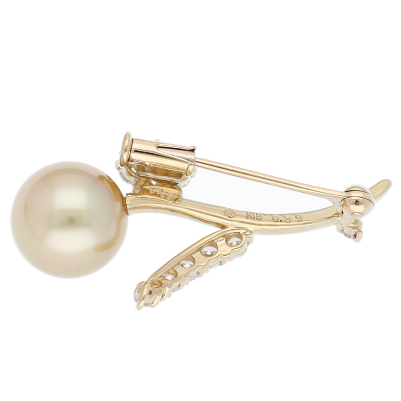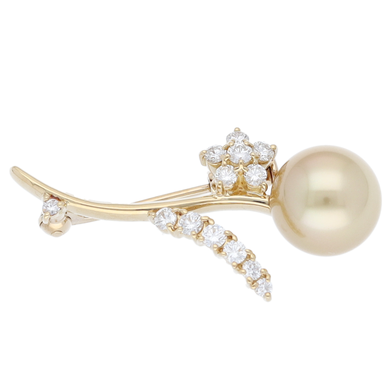 USED品。イエローゴールド製。コートやジャケットのおしゃれはもちろん、帽子やバッグのアクセントとしても大活躍のパールブローチです。